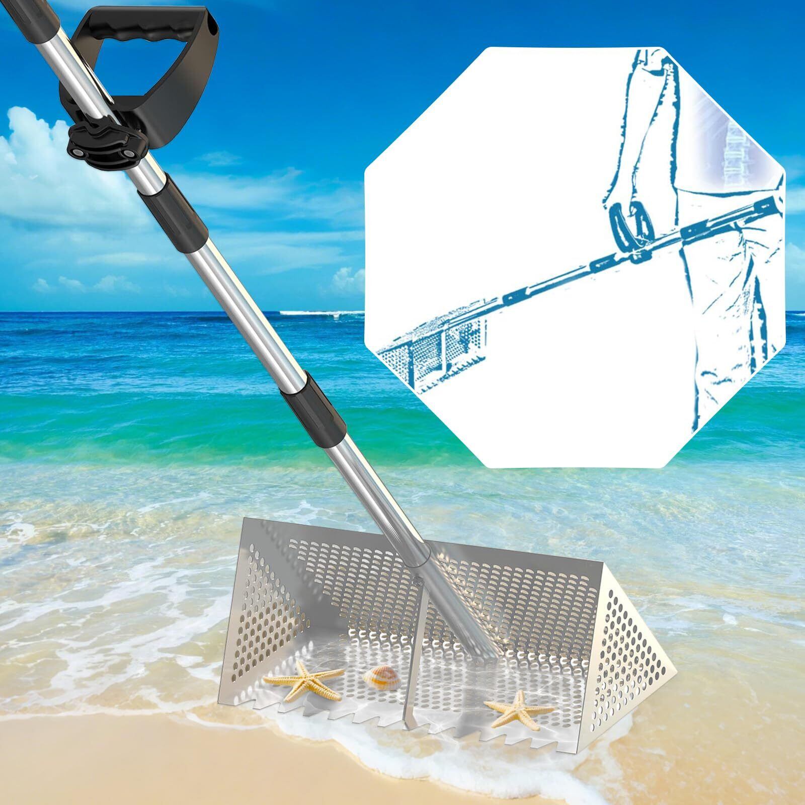 サンドレーキ 砂フィルターレーキ サンドシフトレーキ 砂ろ過レーキ 手持ち式 ロングハンド 折りたたみ式 ステンレス 砂ふるい 砂ほぐし シーフードキャッチャー 海レーキツール 潮干狩り 浦人 漁民 漁業者 シルバー