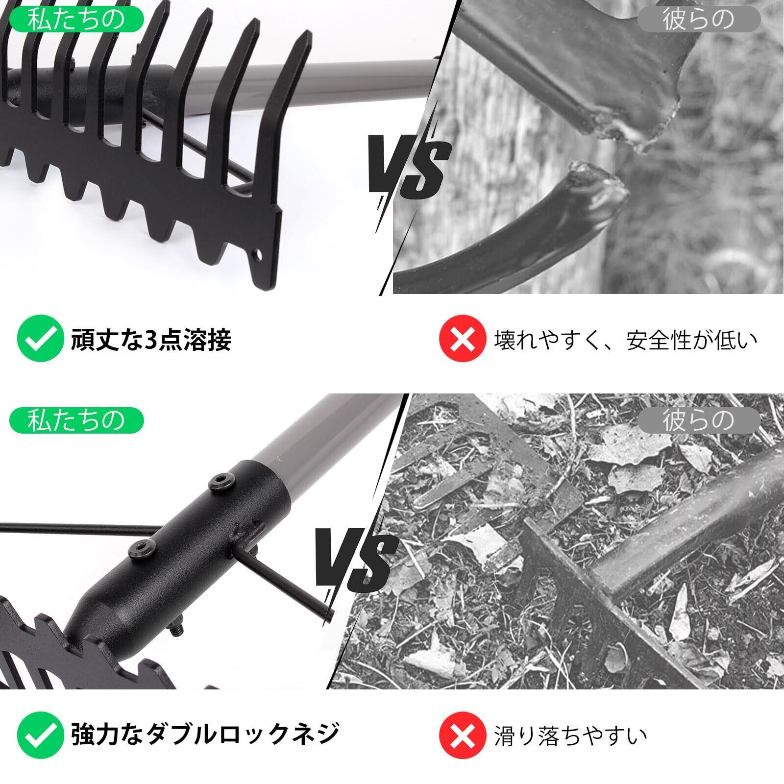 【17本の歯のレーキヘッド】:17本の歯のデザインにより、ガーデン弓型レーキは様々な種類の土に簡単に突き刺さり、土を効率的に緩めるなどのガーデニング作業に役立ちます。6.3cmの長いレーキ歯と17インチの幅広レーキヘッドは、より正確なレベリング、広範囲のカバレッジ、植物の根を傷つけることなくより深い土壌深度を実現します。ヘッドの厚さは3mmで、歯の折れや破損を経験することはありません。ネジを締めると非常に頑丈で、耙いている間にバラバラになったり落ちたりしません。