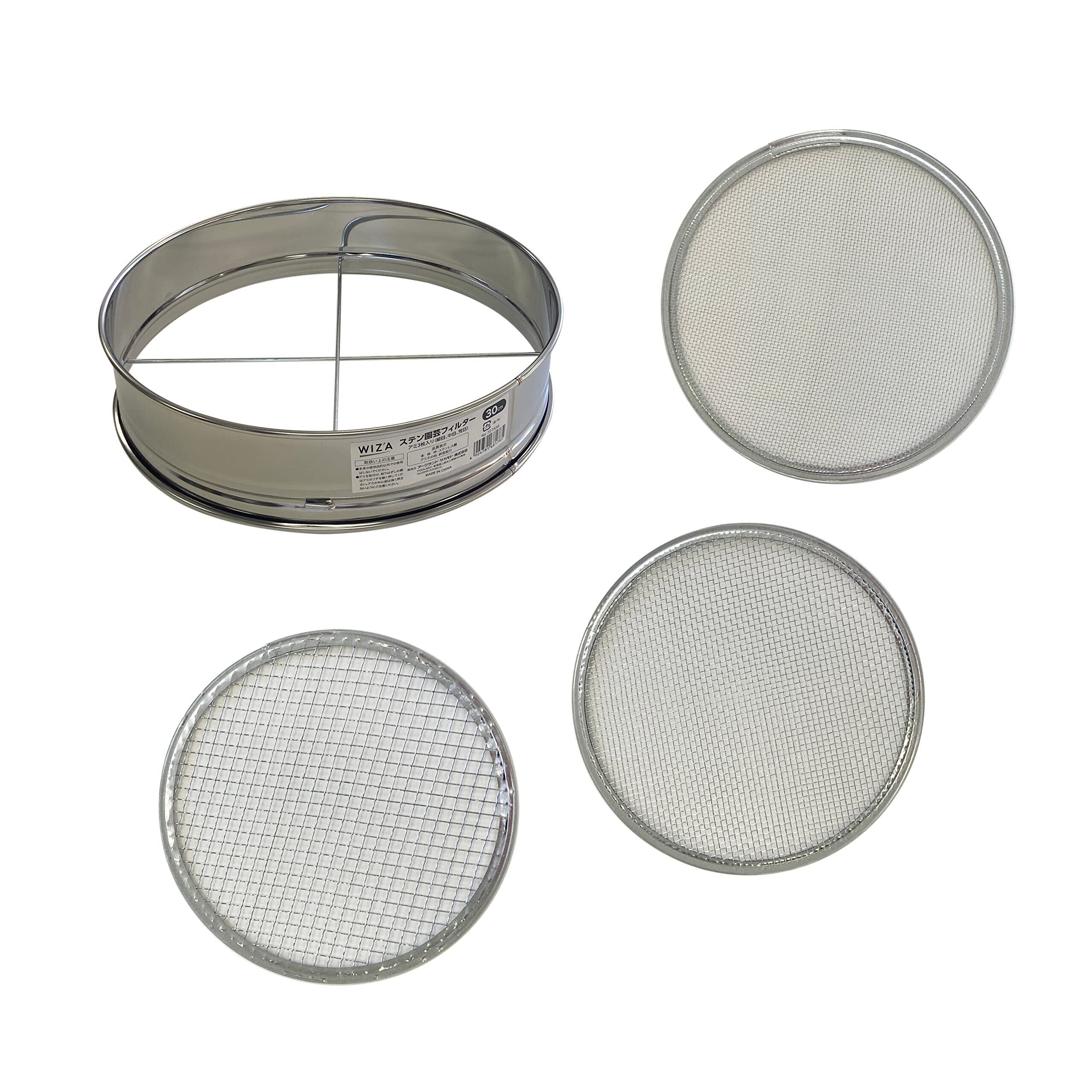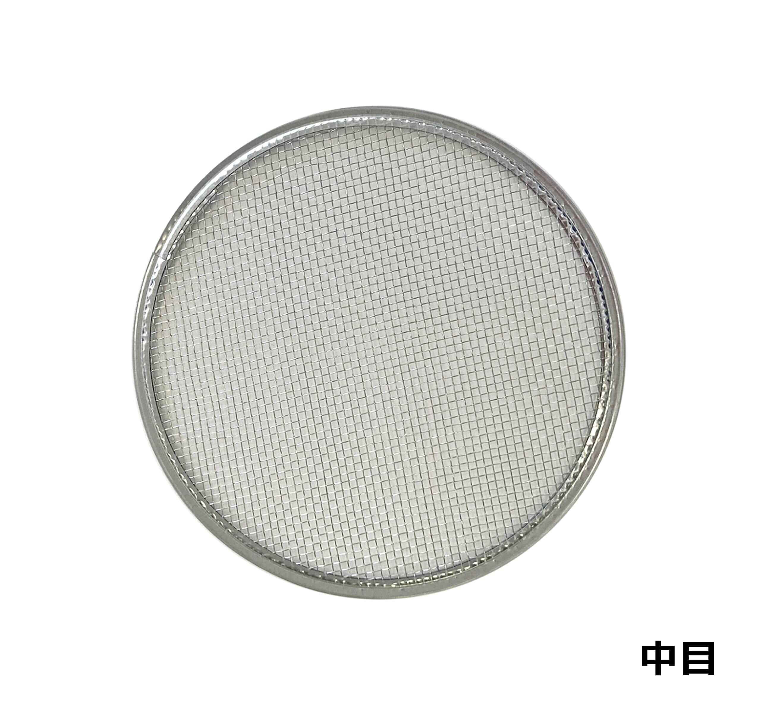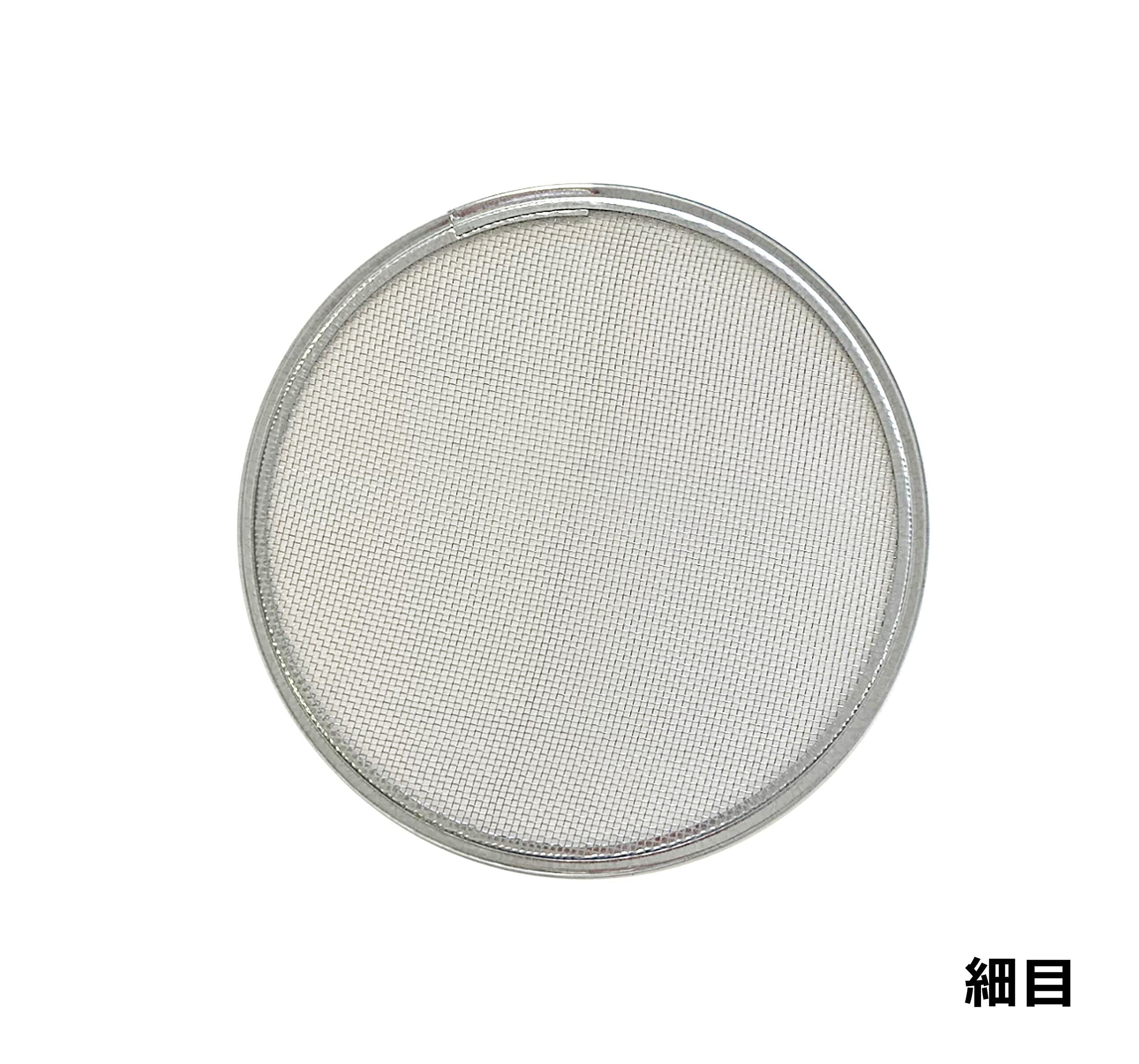 フィルター本体枠はサビに強いステンレス鋼です。網は3種類付き(細目・中・荒目)で小石や土の粒のサイズにより使い分けが可能です。網を取り付け、取り外す際は網の縁を軽く押して下さい。網の中心部は強く押さないようご注意下さい。本来の用途以外で使用しないでください。