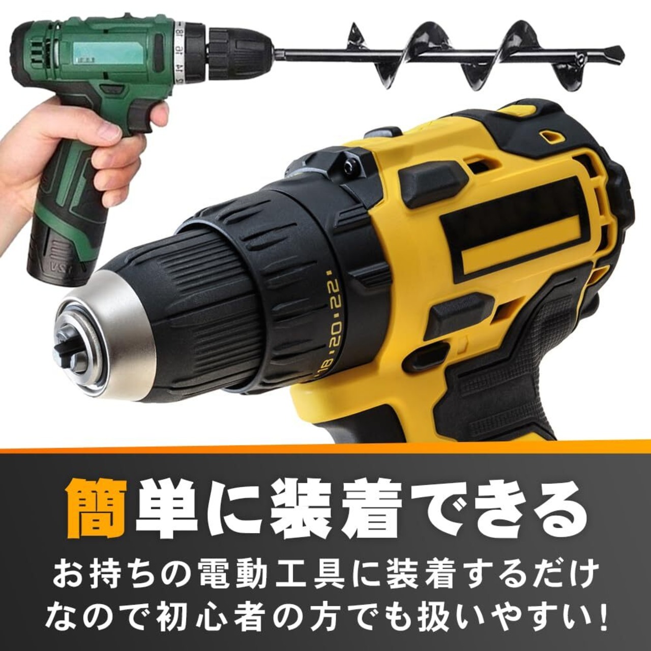 使い方はお手持ちの電動ドリルに本体をセットするだけ!直径が異なる3サイズセットなので、用途に合わせたサイズを使い分けられます。