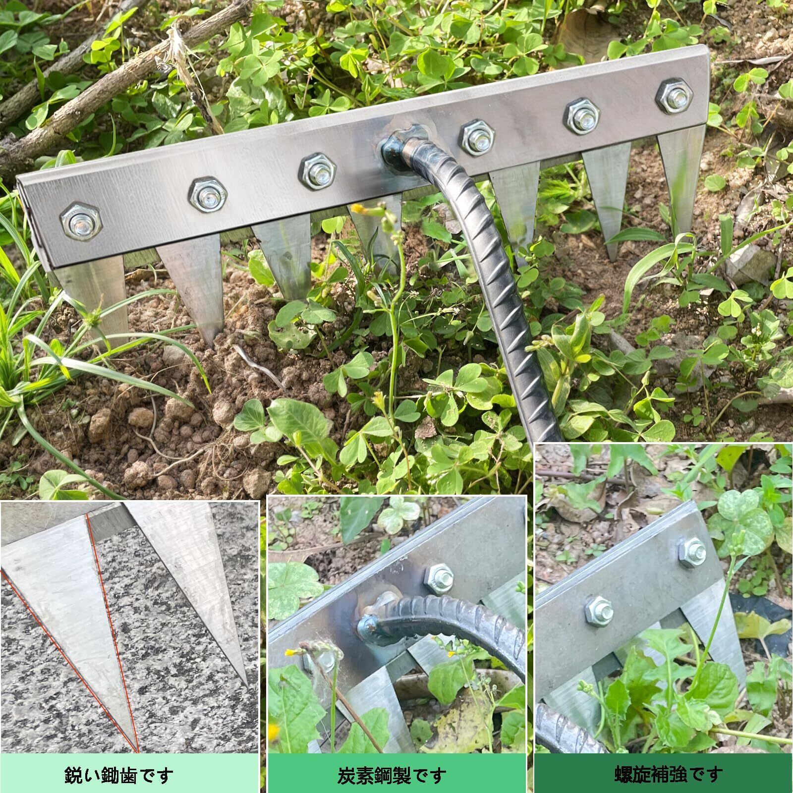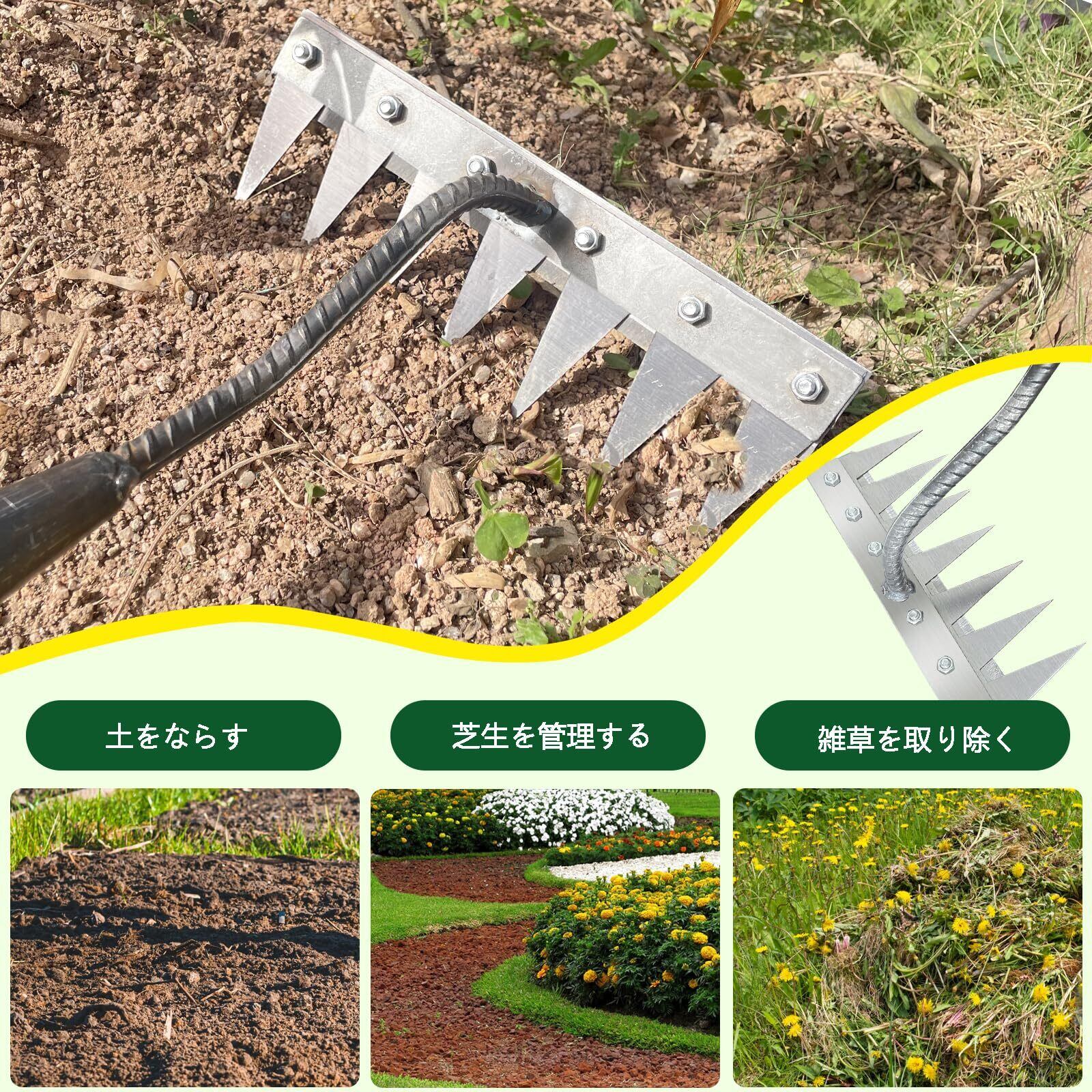 【耐久性抜群】本製品は高品質な金属素材で作られており、耐摩耗性・耐久性に優れた除草レーキです。農業用多機能熊手として、除草、整地、土壌耕しなどさまざまな用途に対応できます。長期間使用しても曲がったり壊れたりしにくい設計です。