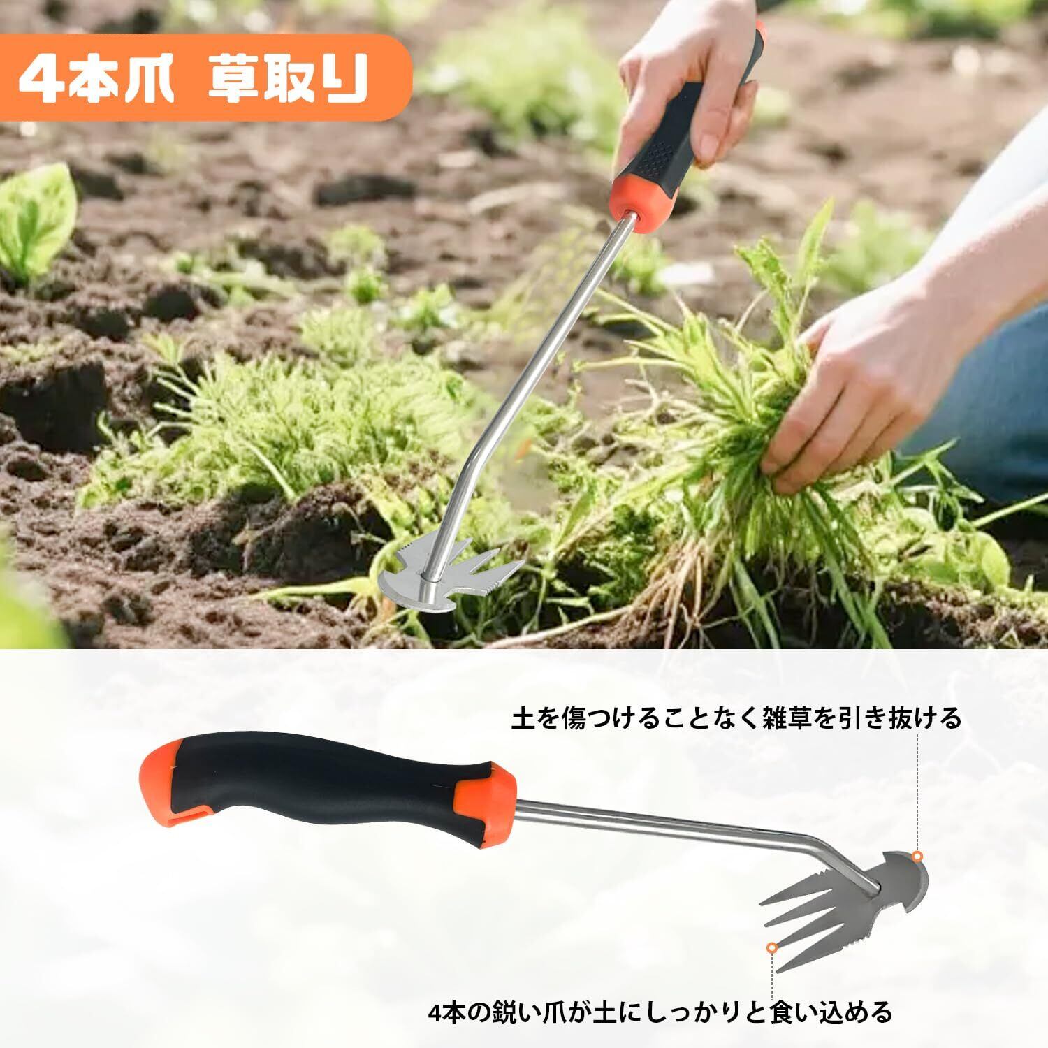 【4本爪タイプ】4本爪タイプの草取り道具は、固い地面や根の張った雑草にも対応可能な万能ツールです。4本の鋭い爪が土にしっかりと食い込み、雑草の根元からグッと引き抜くことができます。細かい雑草だけでなく、タンポポやスギナのような根が深くしつこい雑草にも有効です。小さな畑や花壇、家庭菜園など幅広く活躍してくれる、まさに頼れる一本です。