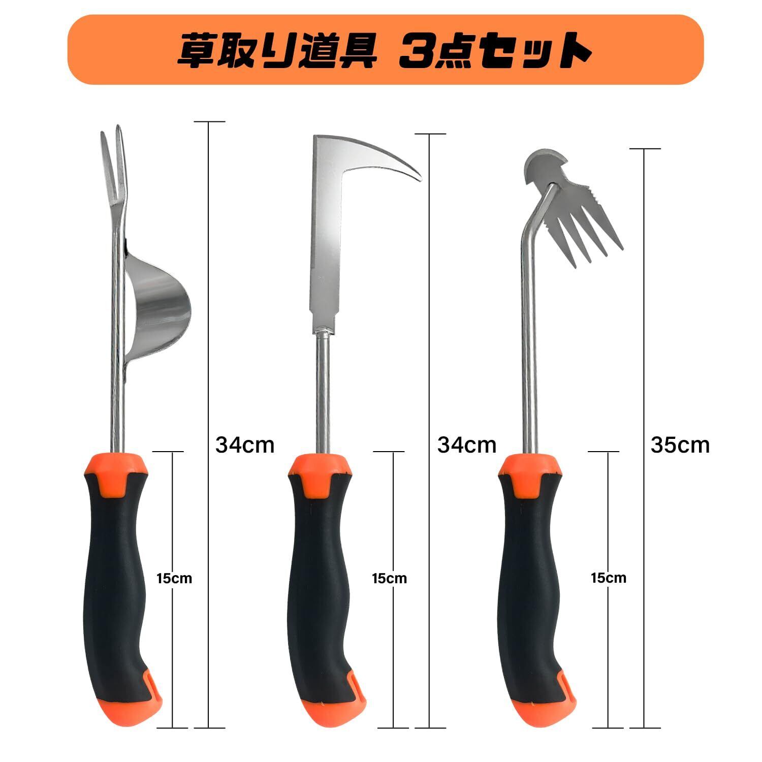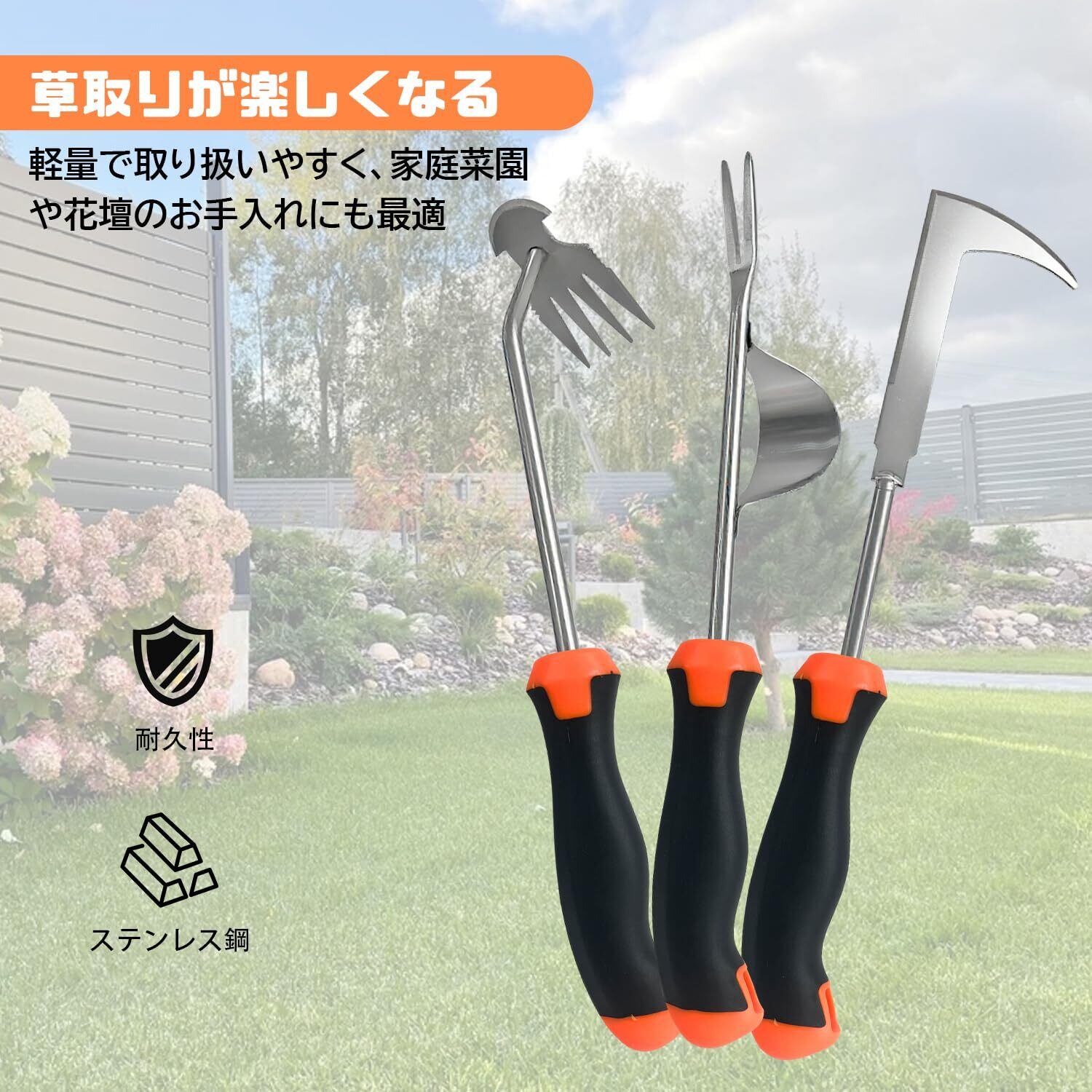 【草取りが楽しくなる】庭や畑を美しく保つ必要な道具です!4本爪タイプ 、片手鍬、テコ付草抜きの3種類の道具を1セットにし、それぞれの特徴を最大限に活かすことで、作業効率をぐっと高める設計になっています。初心者からベテランまで使いやすく、しかも軽量で取り扱いやすいので、家庭菜園や花壇、庭のお手入れに。