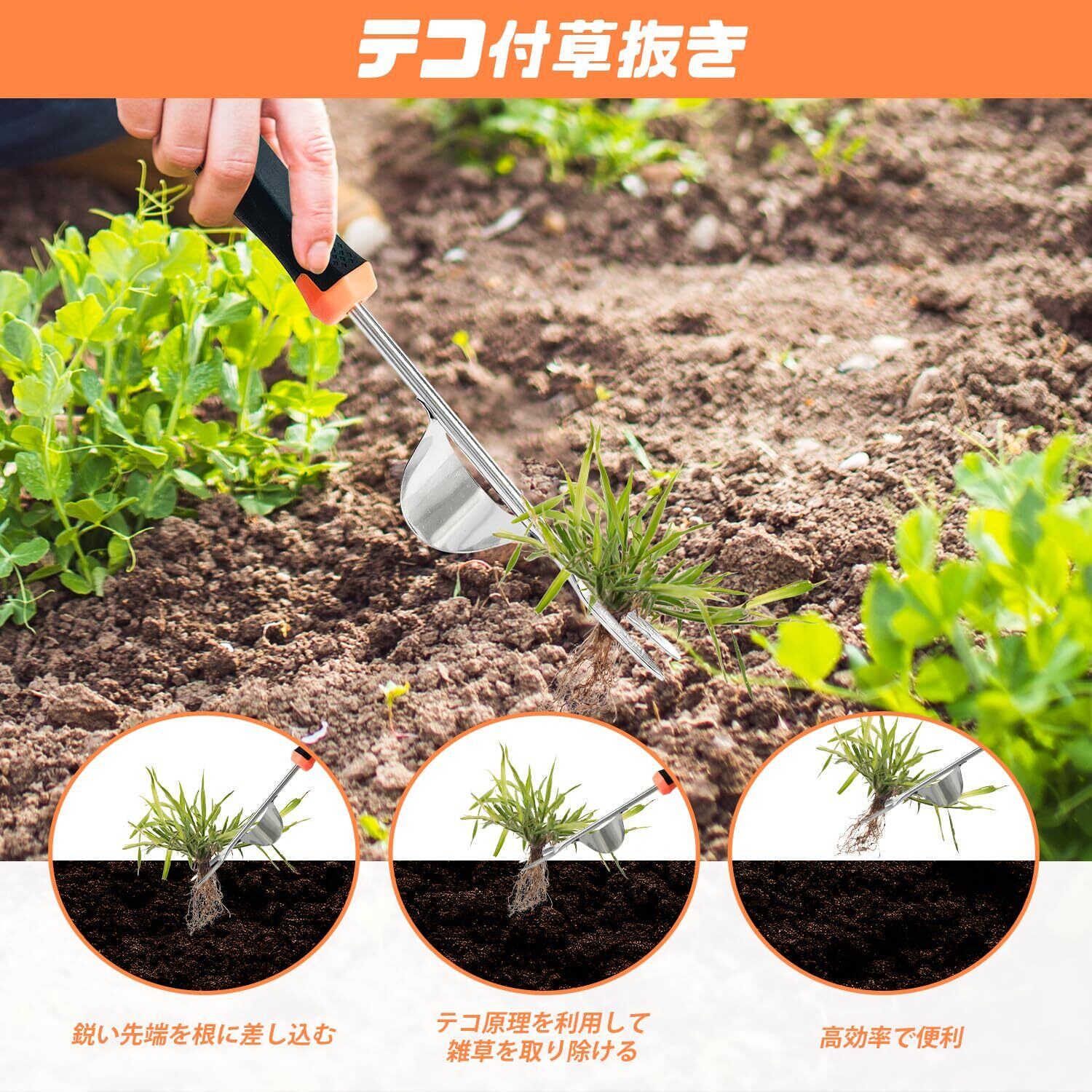 【テコ付草抜き】テコ原理を利用した草抜きにも付属。力の弱い方や高齢の方にもおすすめ。雑草の根元に差し込み、ハンドルを軽く押し下げるだけで、根から簡単に抜くことができます。従来の引っこ抜くタイプと違い、腕力をあまり必要としないため、手や腰への負担を最小限に抑えられます。特に粘土質や湿った土壌など、抜けにくい場所でも威力を発揮。