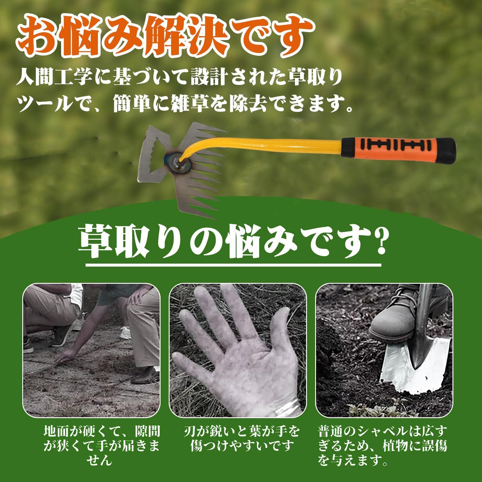 耐摩耗性素材: この草抜き道具は高品質のステンレスで作られており、精密に鍛造および研磨されています。高いレベルの硬度、摩耗、衝撃を備えています。表面が滑らかなので雑草が取りやすく、シャベルに草がくっつきません