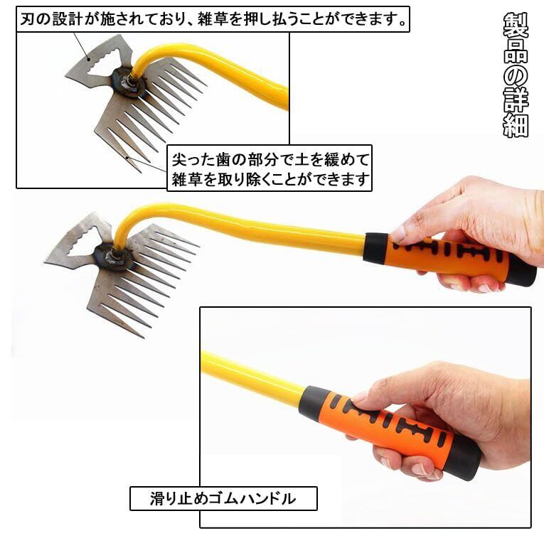 簡単な除草: この雑草取り器具は、狭くて手の届きにくい場所の雑草を取り除くのに役立ちます。11本の鋭い歯を草の根元近くの土に押し込んで引っ張るだけです。特殊研ぎの刃先で雑草を根元まで確実に刈り取ります。 硬い粘土の上でもスムーズに滑ることができます。また、土の表面を砕いて排水を良くします。非常に使いやすく効率的です
