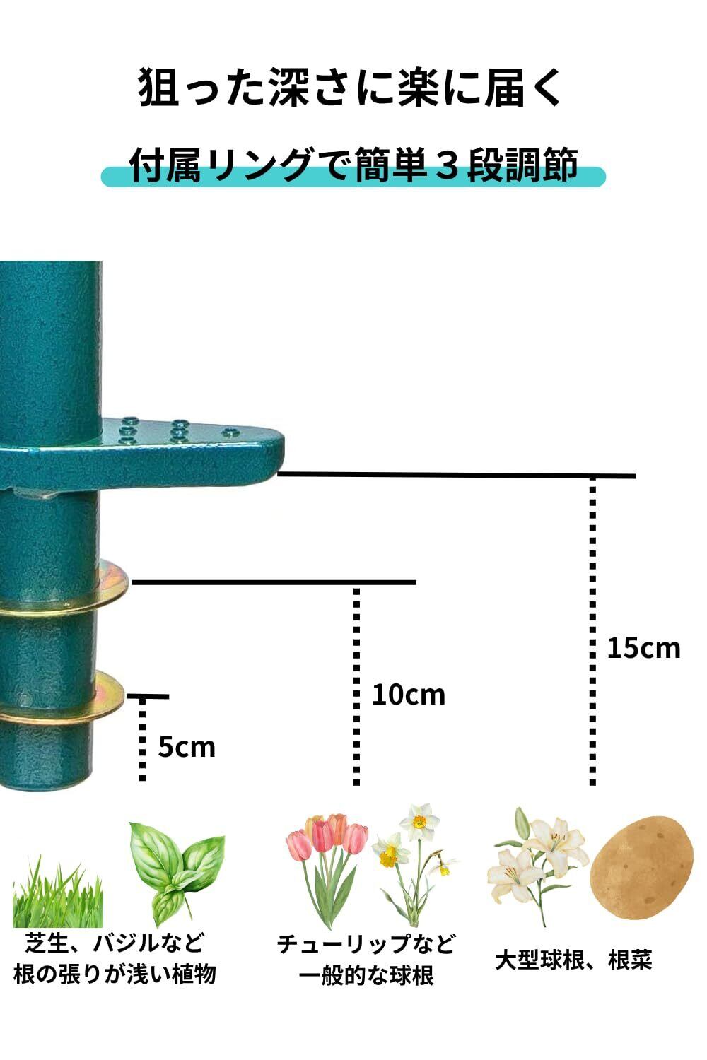 「踏み込む → ひねる → 引き抜く」たったこれだけの動作。直径約 5.4cmの植え穴を、立ったまま連続で素早く掘ることができます。掘り出した土はツール内に自動で溜まり、逆さにすれば簡単に排出可能。付属の深さリングを使えば、約5cm、約10cm、リングなしで約15cmと、常に一定の深さで植え穴を作れます。