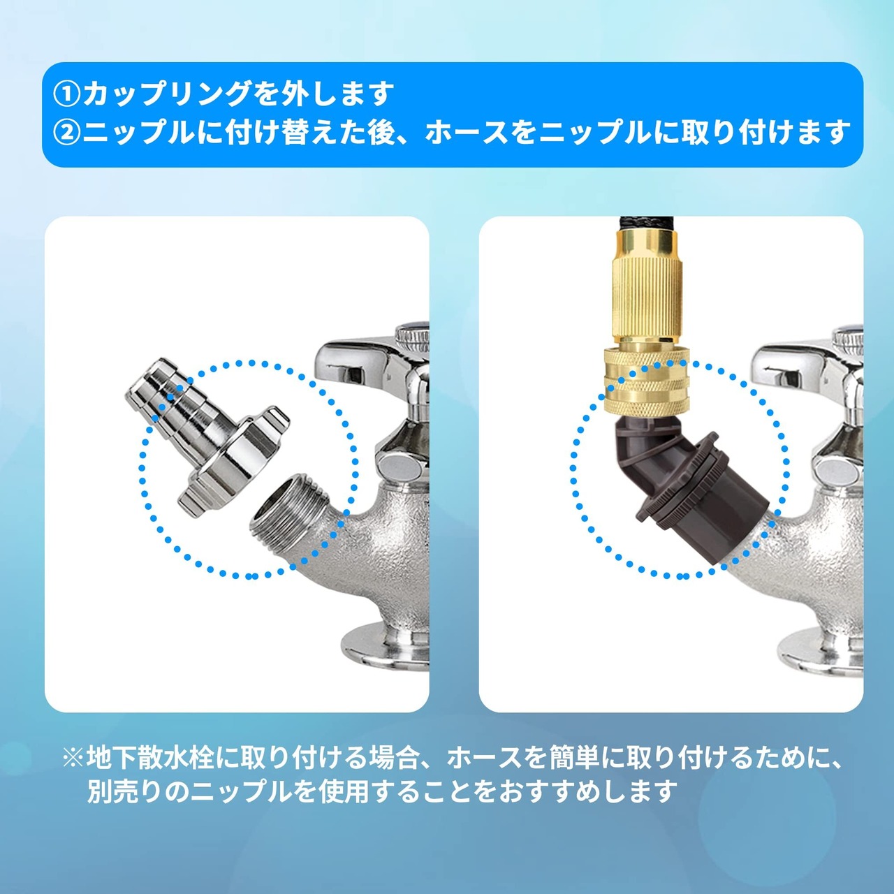 【ご注意】(1)本商品はキッチンや風呂場の蛇口からの使用ではありません。(2)ホースのコネクタはワンタッチタイプではないため、ホースを蛇口に取り付ける前に必ず取扱説明書をお読みください。(3)カップリング付き横水栓を使う場合には別売りのニップルを使用する必要があります。(4)商品パッケージに付属される蛇口用ニップルは直径16mmまでの蛇口の吐水口に取り付けられます。直径16mmより大きい蛇口を使う場合には別売りのニップルを取り付ける必要があります。(5)蛇口用ニップルが取り付けている状態で、蛇口との間から水漏れが発生する場合、蛇口用ニップルを蛇口の吐水口のセンター部に意識して真っ直ぐ押し込み、周囲のネジ(3ヶ所)を更に均等に締め込んでセットしましたところ、水漏れはなくなります。(6)冬に気温が氷点下の環境で散水ノズルを保管しないでください。低温環境で散水ノズルが破損しやすいです。