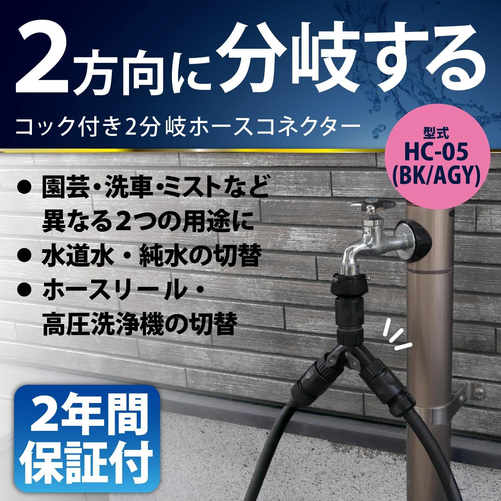グリーンライフ コネクター ホース ジョイント 2分岐コネクター コック付 園芸 洗車 ミスト 複数の用途に 水道水と純水 切替 ホースリール 高圧洗浄機 分岐 W11.2×D4×H11cm HC-05(BK/AGY)