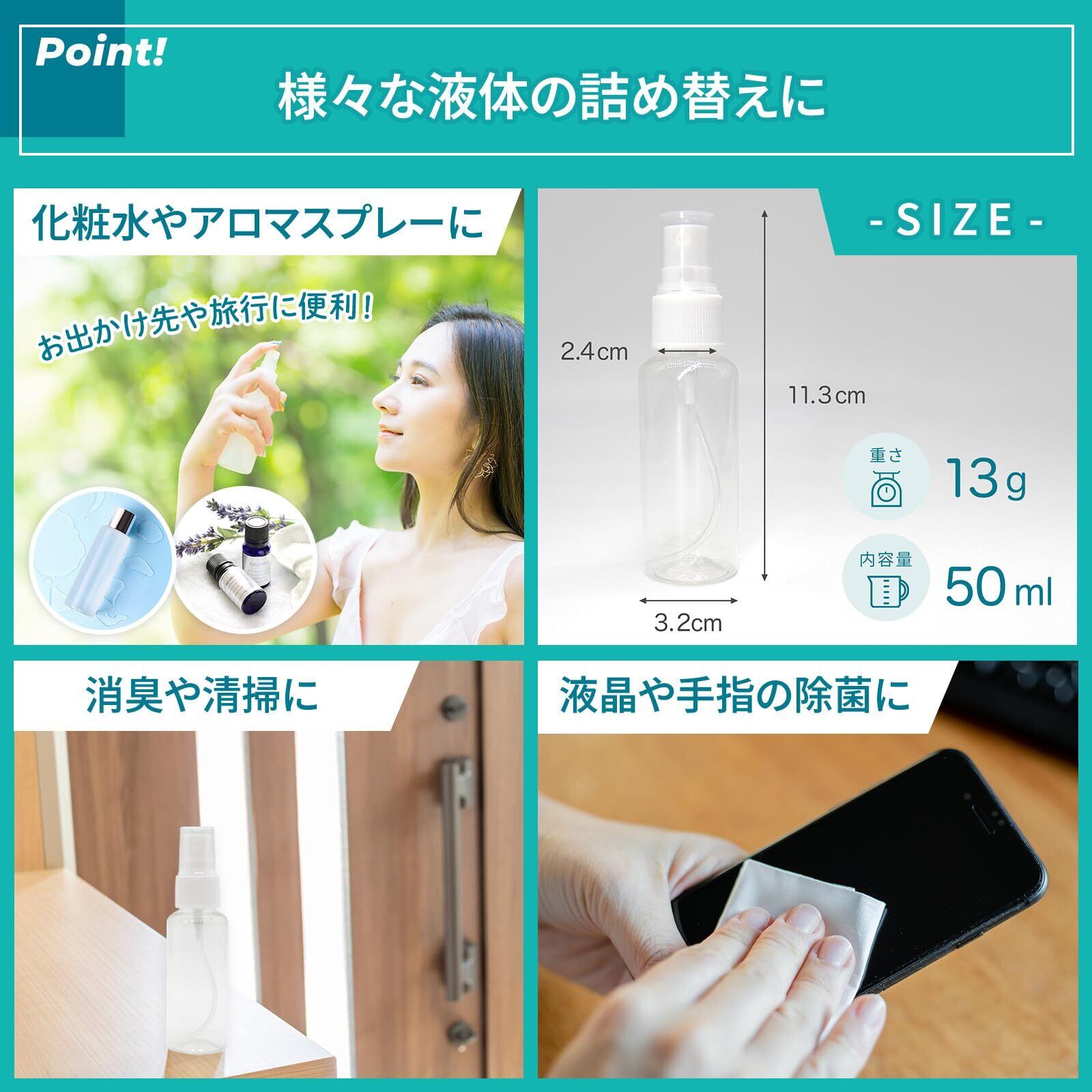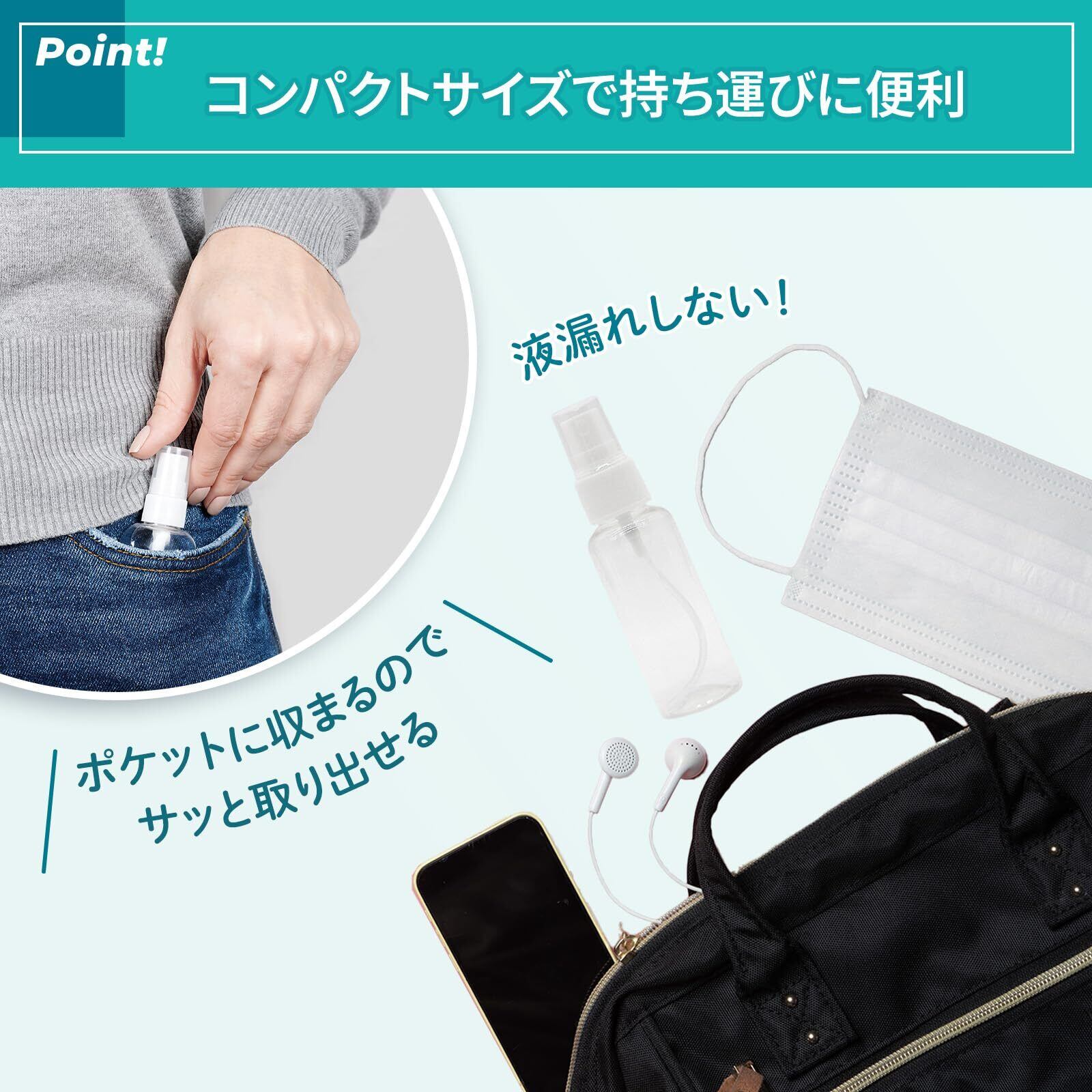 【適用】除菌液、抗菌液の詰め替え、消毒液、ヘアケア、園芸用霧吹き、植物のスプレー、髪の保湿スプレーに最適です。 あらゆる液体の詰め替え容器として大活躍のスプレー容器です,非常に細かいミスト状の噴霧可能です。 アルコール除菌液は使用可能ですが除菌液としてアルコール濃度78%まで可能となります。濃度が濃いアルコールは推奨しておりませんのでご了承ください。 【パッケージ内容】透明PETスプレーボトル : 底部直径:3.2cm 高さ:11.3cm 内容量:約50ml 重さ:約13g ×5本入 【ご使用】軽量で使いやすく、旅行や通勤、屋外や室内にも適用! キレイ好き貴方もいつも清潔感を保てます。 【注意事項】非毒性PET材質を採用して、人にも環境にも優しい。消毒液やを入れた場合、直射日光の当たる場所や温度差の激しい場所(電化製品の上など)での保管は避けてください。 ボトル材料:食品グレードのPET原料、環境保護、安全性、非毒性、漏れなし。 スプレー材料:高品質PPプラスチック、消毒液、アルコール対応 ・非常に軽く、使いやすく、持ち運びが簡単です。 知ってほしいこと・・・生産上若干傷が付く場合がございます、また保護袋の中でも傷が付く場合がございますのでご了承ください。Amazonセンターより出荷いたしますがボトルとスプレー部分を取り外して同梱包しておりますのでご了承いただきますようお願いします。