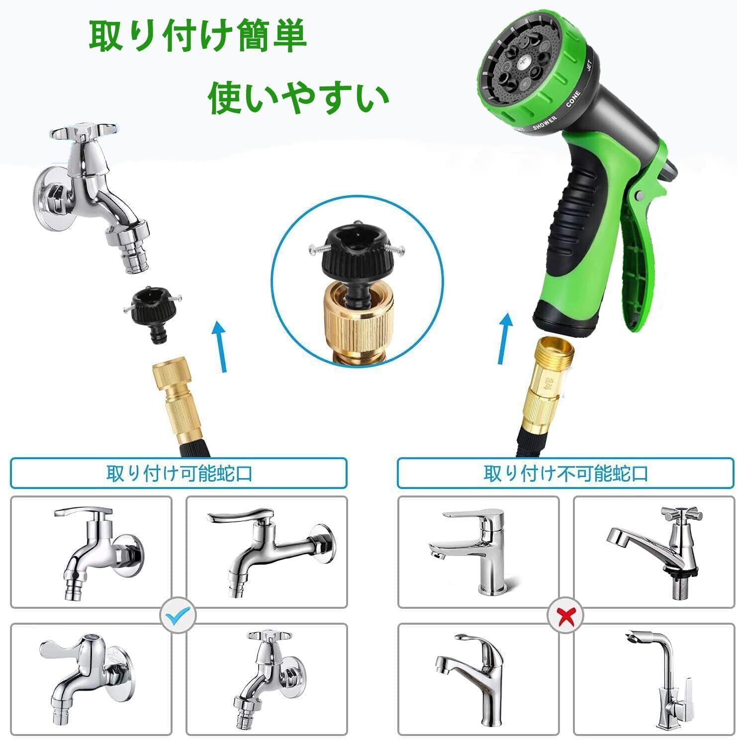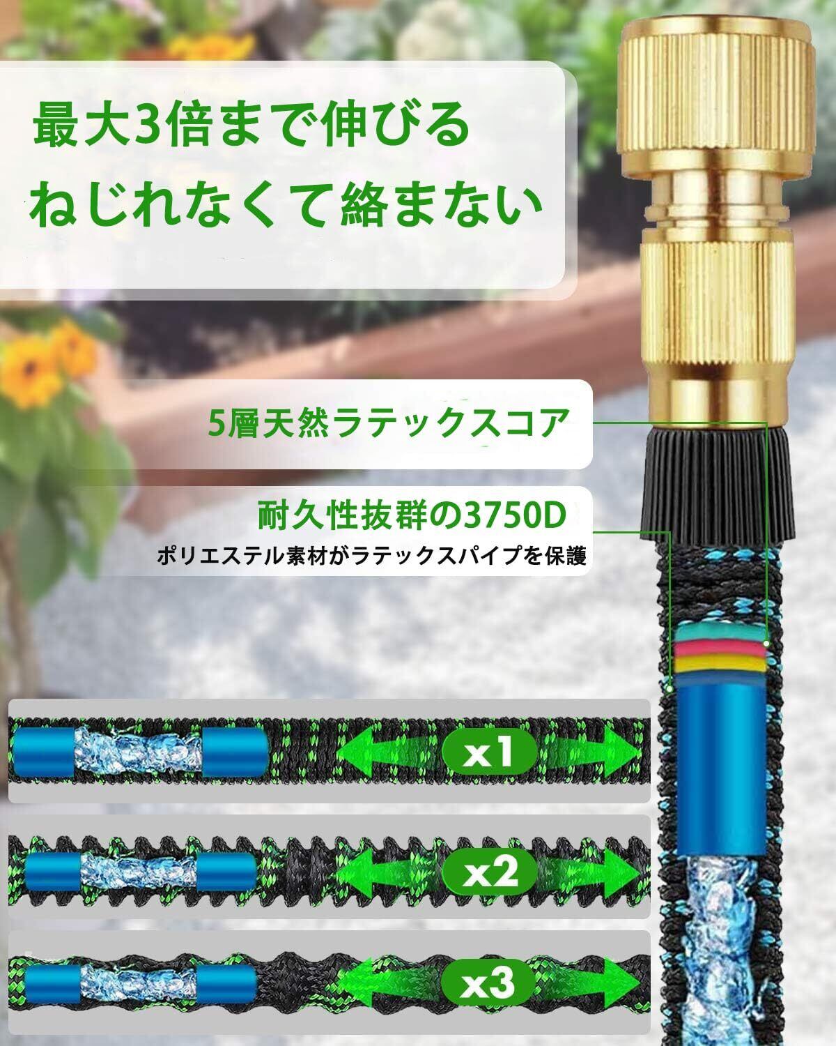 【3倍に伸びる伸縮ホース】伸びるホースは自然収縮タイプで、水圧に応じ元の3倍まで伸びる。蛇口を開けて15秒で伸縮自在、伸びても絡まず、水なくなると元に戻る。広い場所や遠くでの散水に便利で、水撒きや掃除負担軽減。ご注意:ホースの長さは水圧によって変化し、0.3MPa以上の水圧で最大3倍に伸びます。また、ご家庭の水道の蛇口を全開にして、ホースに水の充填が十分にしていないと、ホースが伸びません。組み立て簡単で、漏水防止用Oリング内蔵により安心して使用可能。