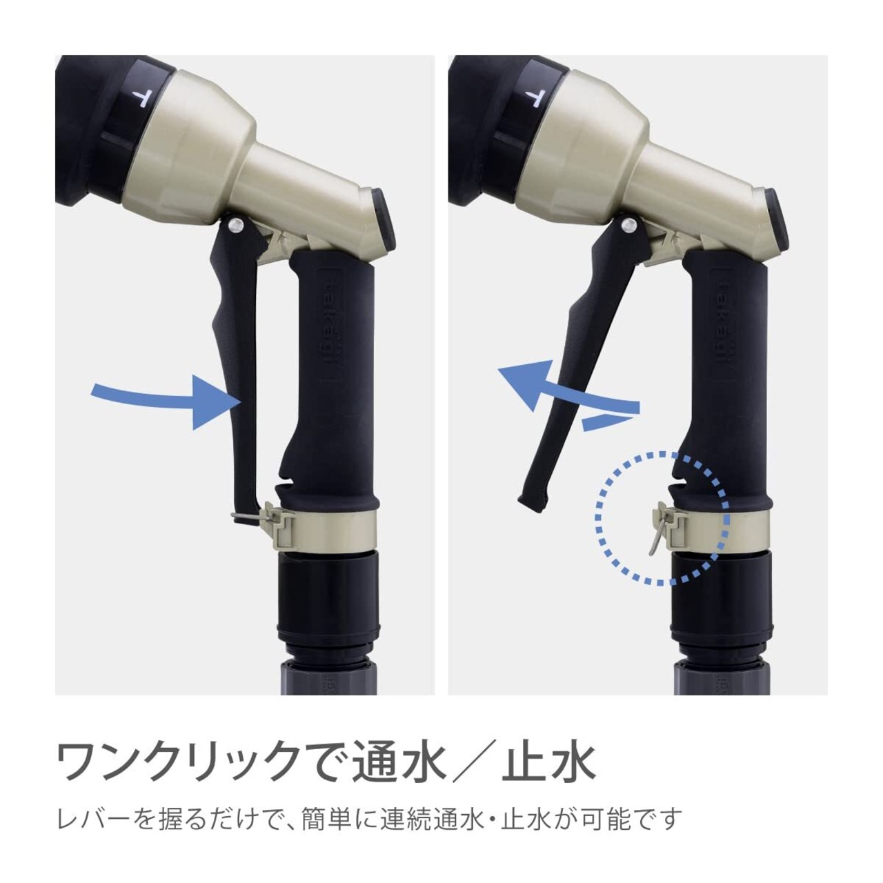 レバーを握ると連動してストッパーがロックされ、通水中の手への負担を軽減します。