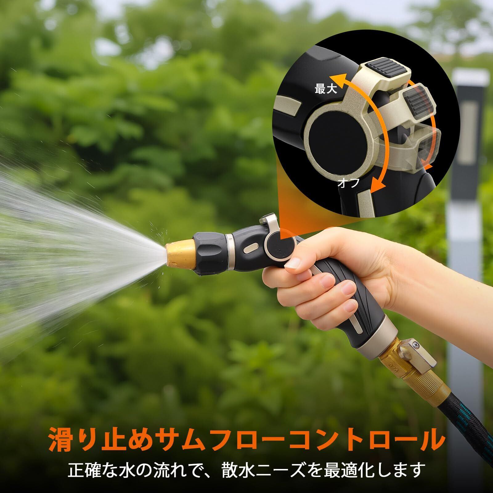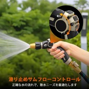 【親指コントロール式スプレー】親指で簡単に水圧調整&オン・オフ切り替えが可能。指一本でスムーズに操作できるため、負担なく快適に使用できます。流量調整部分には滑り止め加工が施されており、しっかりとしたグリップ感を実現。庭や芝生、植物、花壇の水やりに最適な便利ツールです。