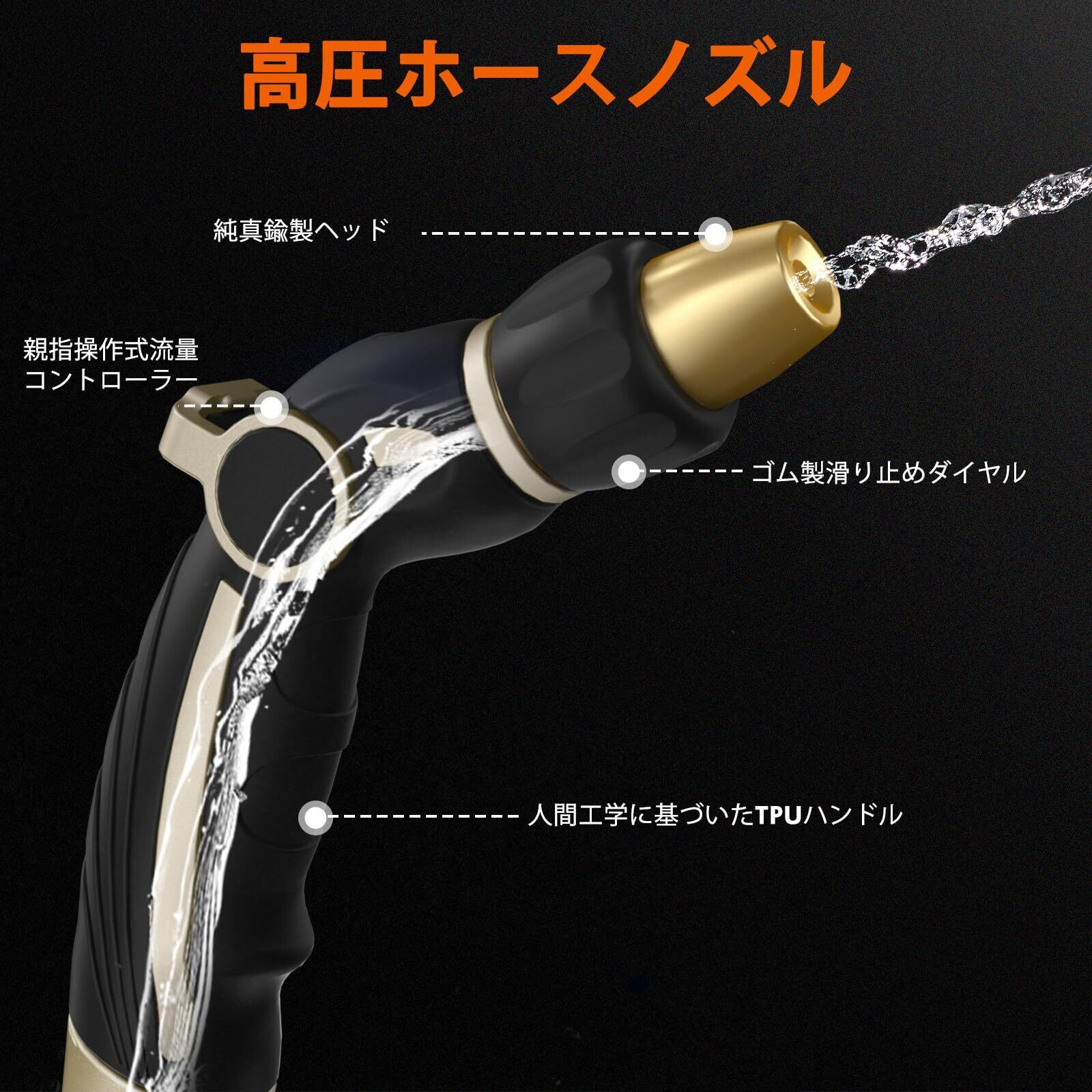 【頑丈な金属製ホースノズル】高品質の亜鉛合金製で、耐衝撃性に優れた頑丈なガーデンノズルです。ヘッド部分には高耐久の真鍮を使用し、TPUコーティングとラバーダイヤルで耐久性と柔軟性を向上。衝撃や強い力にも耐える、長く愛用できる散水ノズルです。