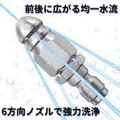 革新的なデザイン: 前方1方向、後方6方向に配置されたノズルから広がる均一な水流が、パイプやヘッダーの内面をまんべんなく包み込み、徹底的に洗浄。機能美と精密さが融合したノズルです。