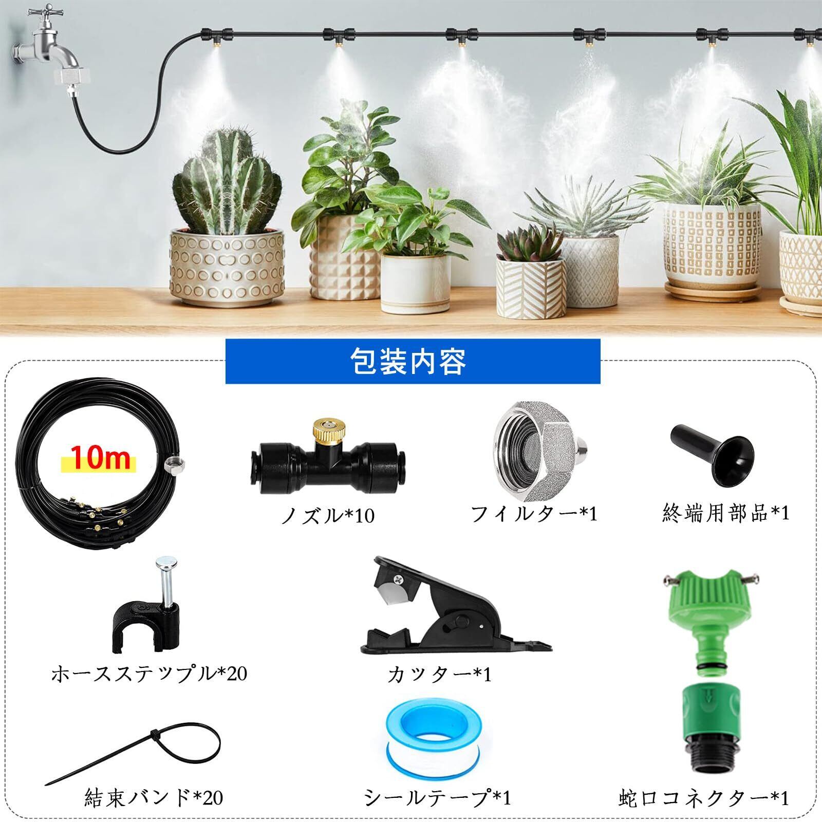 【セット内容】10mホースx1、蛇口コネクターx3、標準ティー(ミストノズル)x10、結束バンドx20、ホースステップルx20、カッターx1、シールテープx1、終端用部品x1、取扱説明書x1。