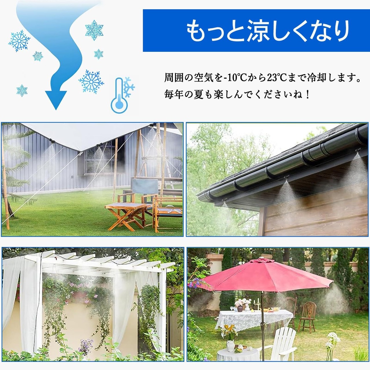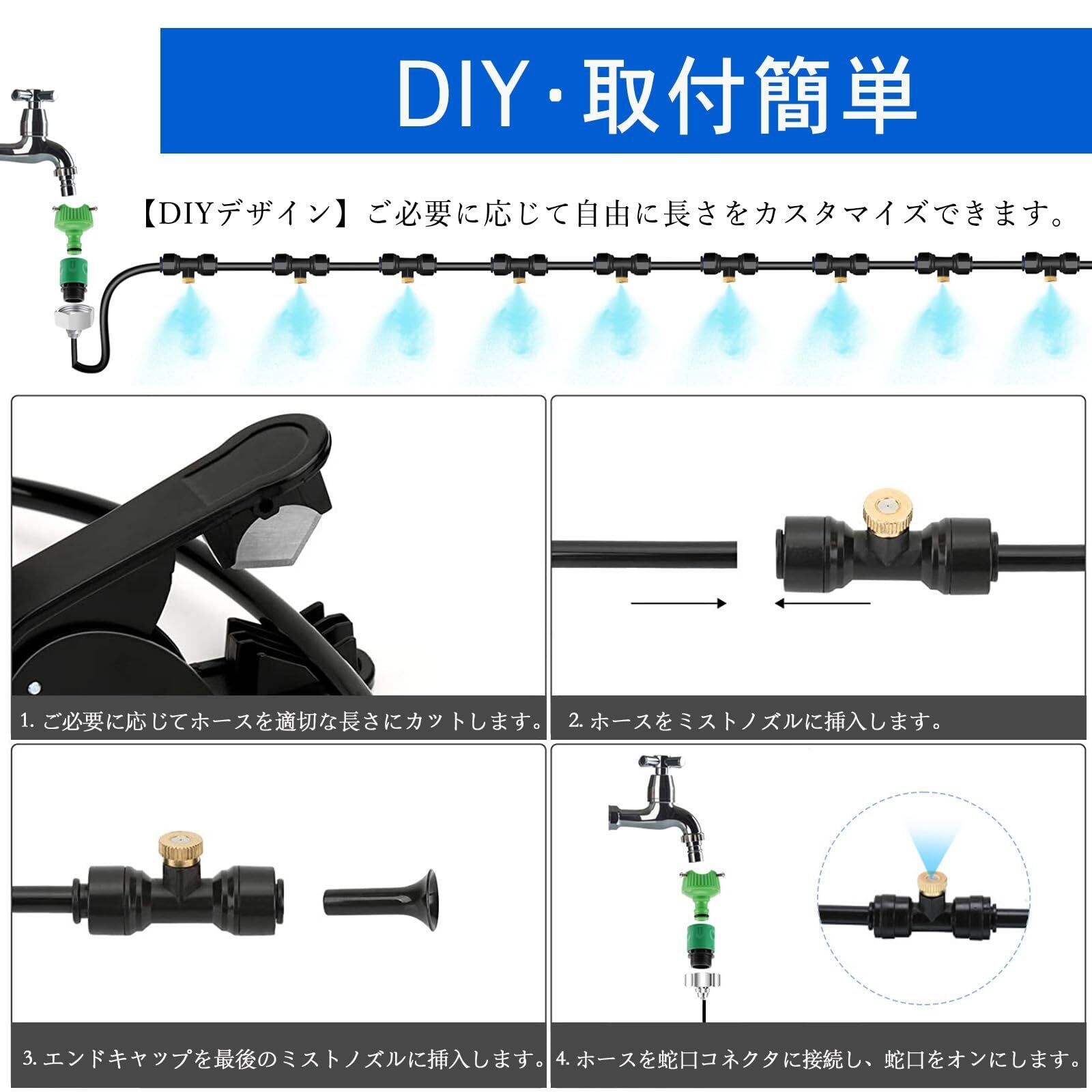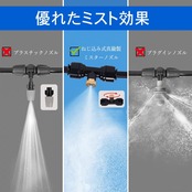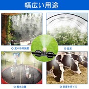 【様々な用途に】植物灌漑、野菜庭、芝生ミスト、冷却システム、冷却システム、塵の除去、ミストシャワー、ガーデン加湿できます。また、扇風機と併用すると小型の加湿器になります!花壇、菜園のような手の届きにくいところにも一度に水やりできます。緑化管理はより便利で省時間・省労力です。