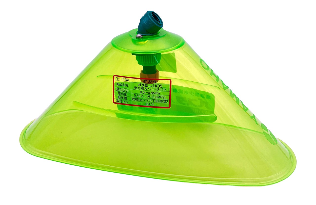 メーカー:ヤマホ工業//品名:バスタノズルLV35カバー (動力用)//品番:473296//JANコード:4530217109815//本体サイズ(全長×全高×全幅):約320×150×130mm//重量:約0.104kg//ノズル名称:N-KA-8BRG//平均粒子径(μm):788(0.5MPa)//適正圧力(MPa):0.5~0.8//噴出量:0.59 L/分 (0.5MPa)//散布幅:約65cm(※散布幅はノズルからの距離が30cmでの数値)//取付ネジ:G1/4/