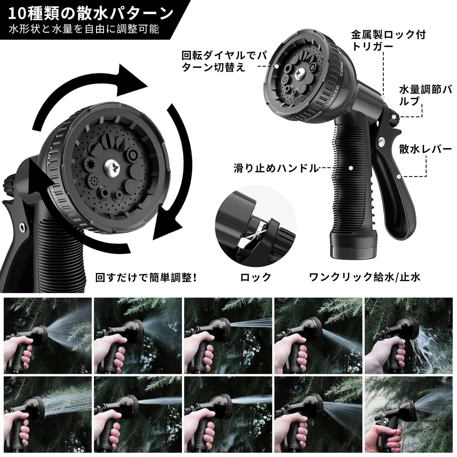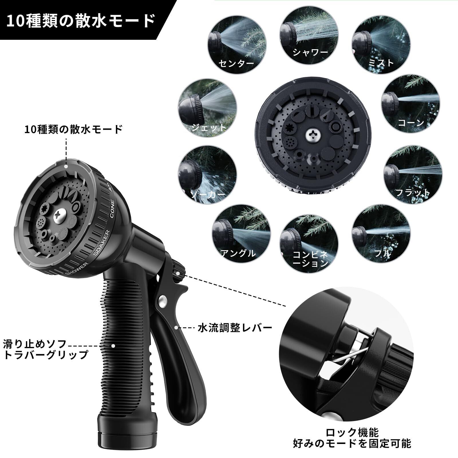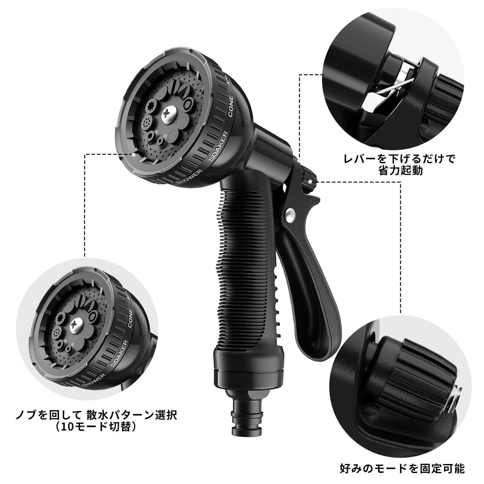 散水ノズル 10モード切替 ホースヘッド 高水圧対応 ガーデニング/洗車兼用 耐凍結設計 水漏れ防止 ブラック