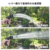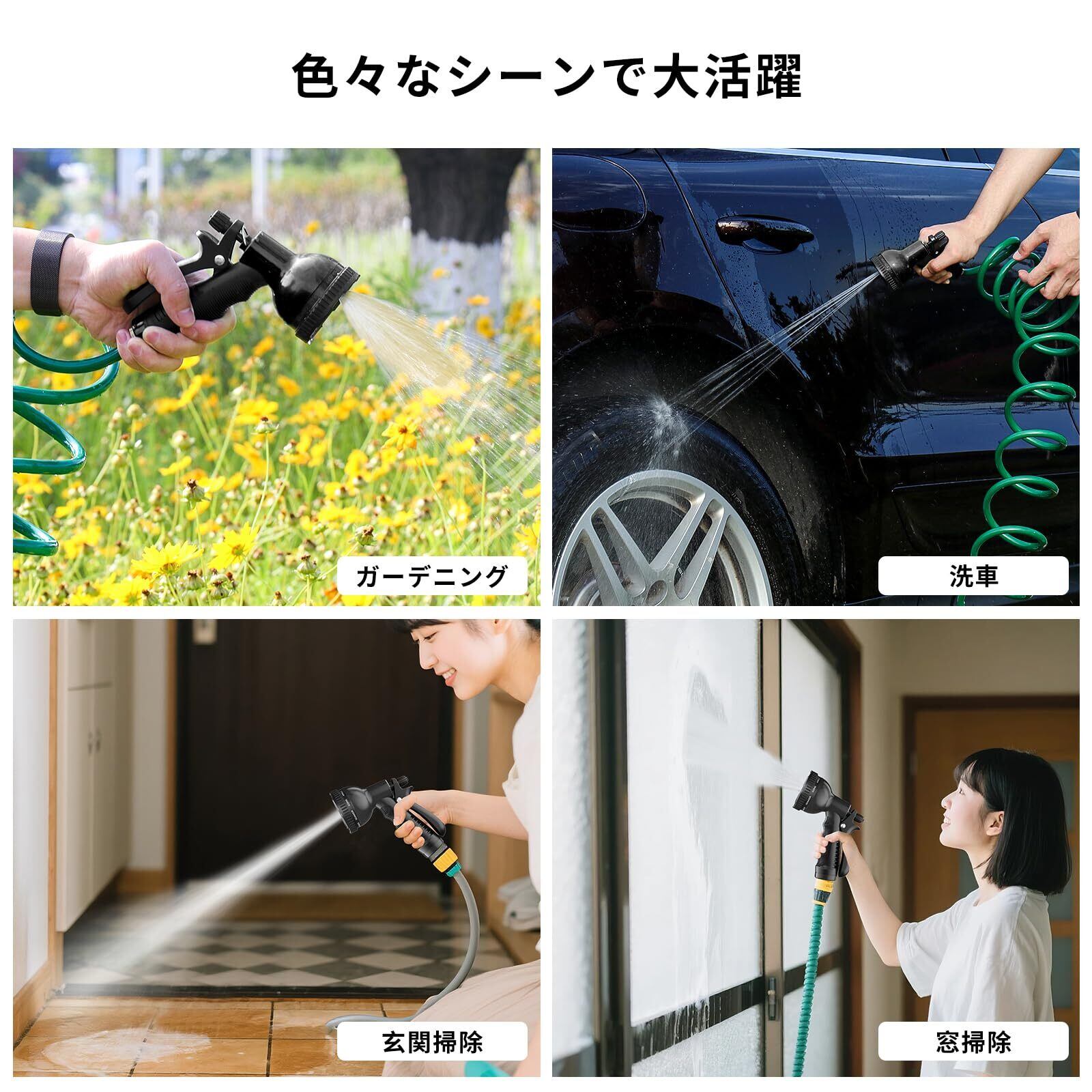 庭の手入れや洗車だけでなく、ベランダ清掃・ペットシャワー・エアコン室外機のホコリ取り・玄関アプローチの水洗いなど、あらゆる家庭用水シーンに対応。軽くて握りやすいグリップで、長時間の使用も疲れにくい設計です。