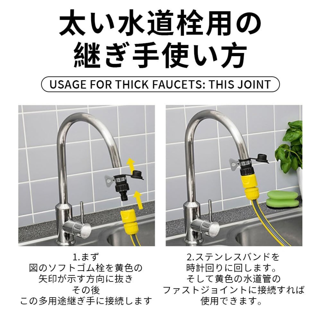 【幅広いシーンで大活躍】 キッチン・バスルーム蛇口はもちろん、洗濯機・食器洗い機への分岐、庭の散水ホース接続、車の洗車やペットシャンプーにも対応。1台あれば生活のさまざまな場面で活躍します。