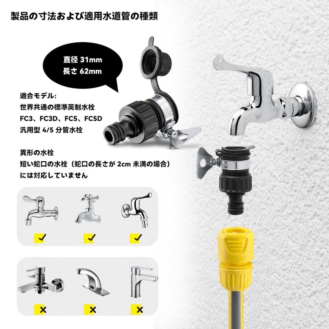 蛇口コネクター 適用水道管の種類:FC3、FC3D、FC5、FC5D、汎用型 4/5 分管水栓 異形の水栓、短い蛇口の水栓(蛇口の長さが 2cm 未満の場合)には対応していません