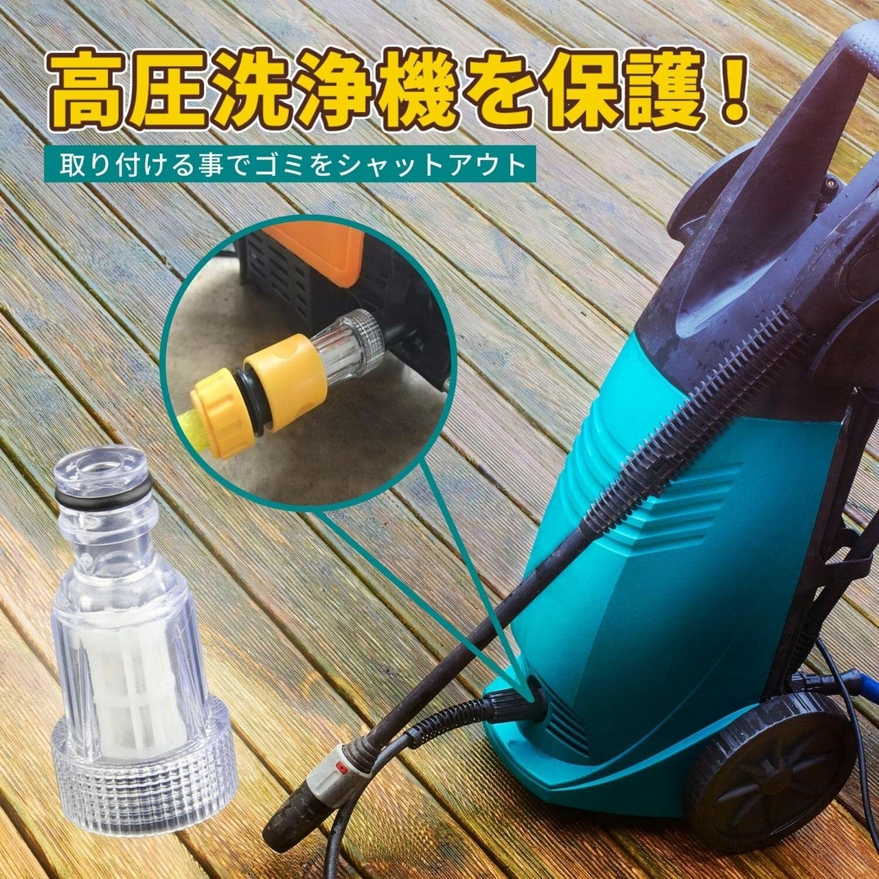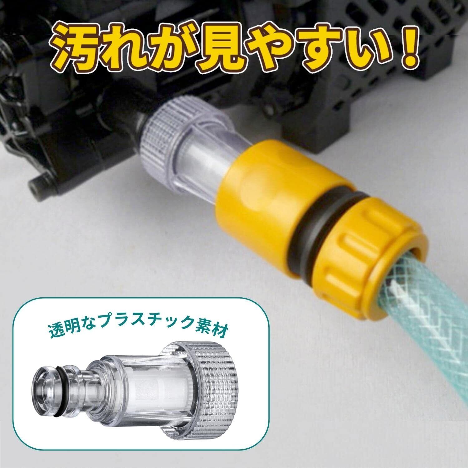 【製品紹介】水道接続、井戸水、雨水や貯めた水などを使用する際に、本体の給水口に取り付けて金属片やゴミの混入を防ぎます。透明でフィルターの汚れを確認することが可能です。ポンプにきれいな水を供給し、機械の故障を防ぎます。機械給水口ホースコネクターの間にインラインで収まります。フィルター部は取り外し洗浄可能です。