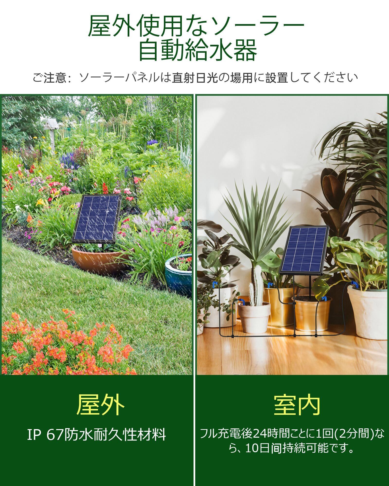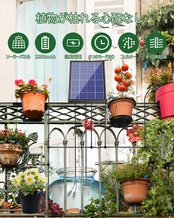 [ソーラー自動灌水器]電源も水道も要りません。ソーラーパワーで自動給水、複雑な配線等が一切いりません。太陽光で動くポンプが水タンク(別売り)からチューブを通して複数のノズルに自動配水目的と規模に応じた水やりを実現出来します。2200mAh充電電池内蔵していますので、曇りの日でも給水可能。