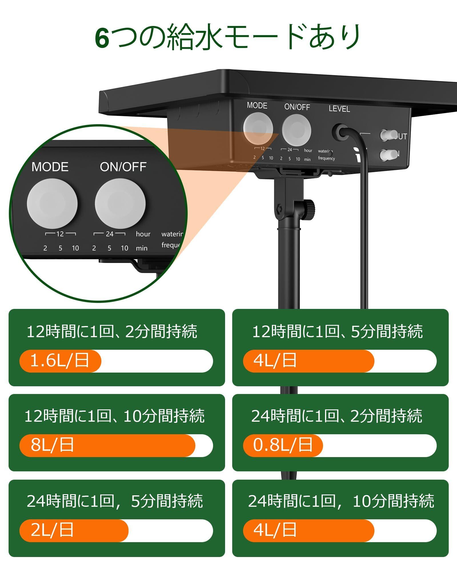 【操作が簡単で高機能】当該自動給水器は給水スケジュールができるから、便利でエコです。給水モードを設定すれば、最適な水やりができます。ソーラーパネルは二つの取付方法があります。壁に取り付けても、地中に差し込んでも、ご使用の空間に合わせて選ぶことができます。
