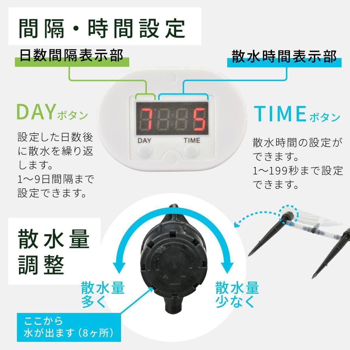 【出張や旅行時の水やりに】設定した日数間隔で植木に自動で給水します。給水日数の間隔は1~9日間、給水時間は1~199秒間の間で設定が可能。