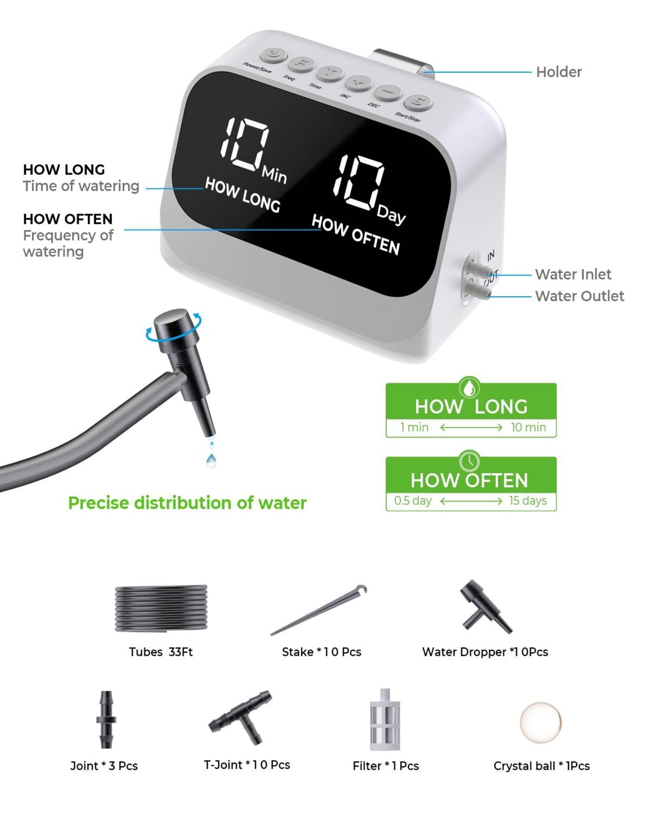 [最先端のプログラム]他の人が優越性を示すためにますます多くの数字を使用しようとしている間、私たちは繰り返しの実験室テストとユーザーフィードバックを通して最もインテリジェントなプログラムを開発しました。各散水時間の調整範囲は1〜10分であり、散水頻度の調整範囲は0。5日に1回から15日に1回である。私たちの自動散水システムは、あなたの鉢植えの植物のそれぞれが十分な水を飲むことを可能にします。