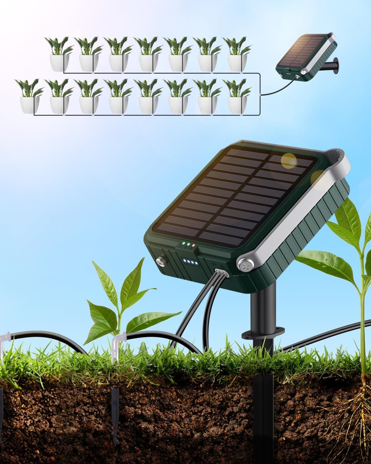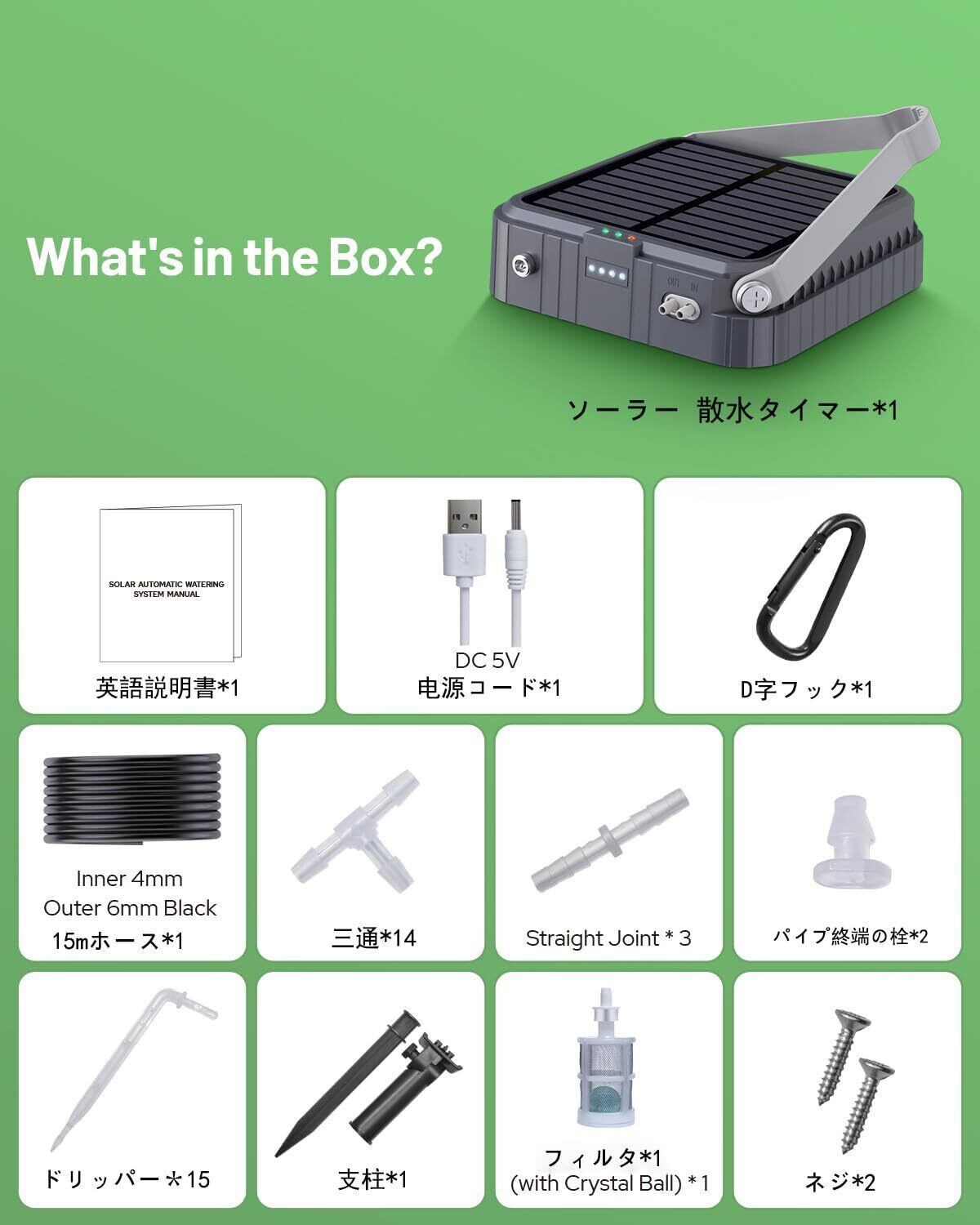 ソーラー式自動散水タイマー, 15鉢対応, 15m散水ホース付き, 屋内外兼用, 植物自動水やりシステム 自動灌漑装置 自動散水機 家庭用 ガーデニング用品 水やりシステム 留守 鉢植え給水 (グリーン)