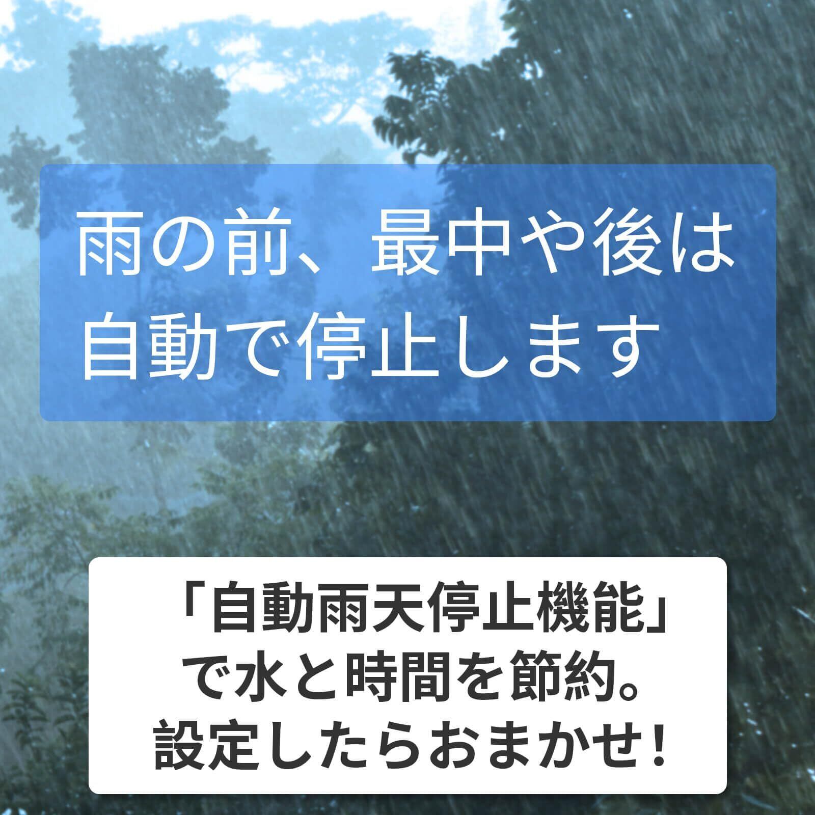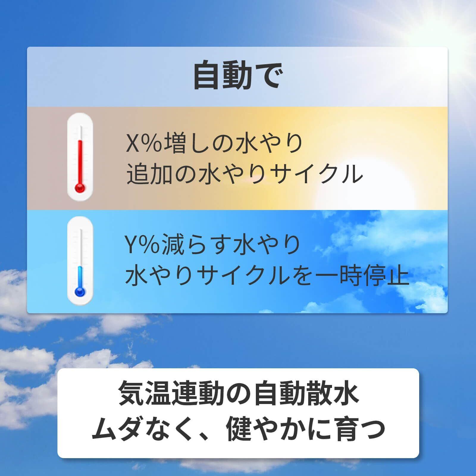 天候連動・スマート自動水やり機能 - スマホやPCから庭の散水をどこからでも簡単に管理することが可能です。リアルタイムの気象データに基づき、自動で散水スケジュールを最適化します。水のムダを削減し、植物に最適な水やりを実現します。