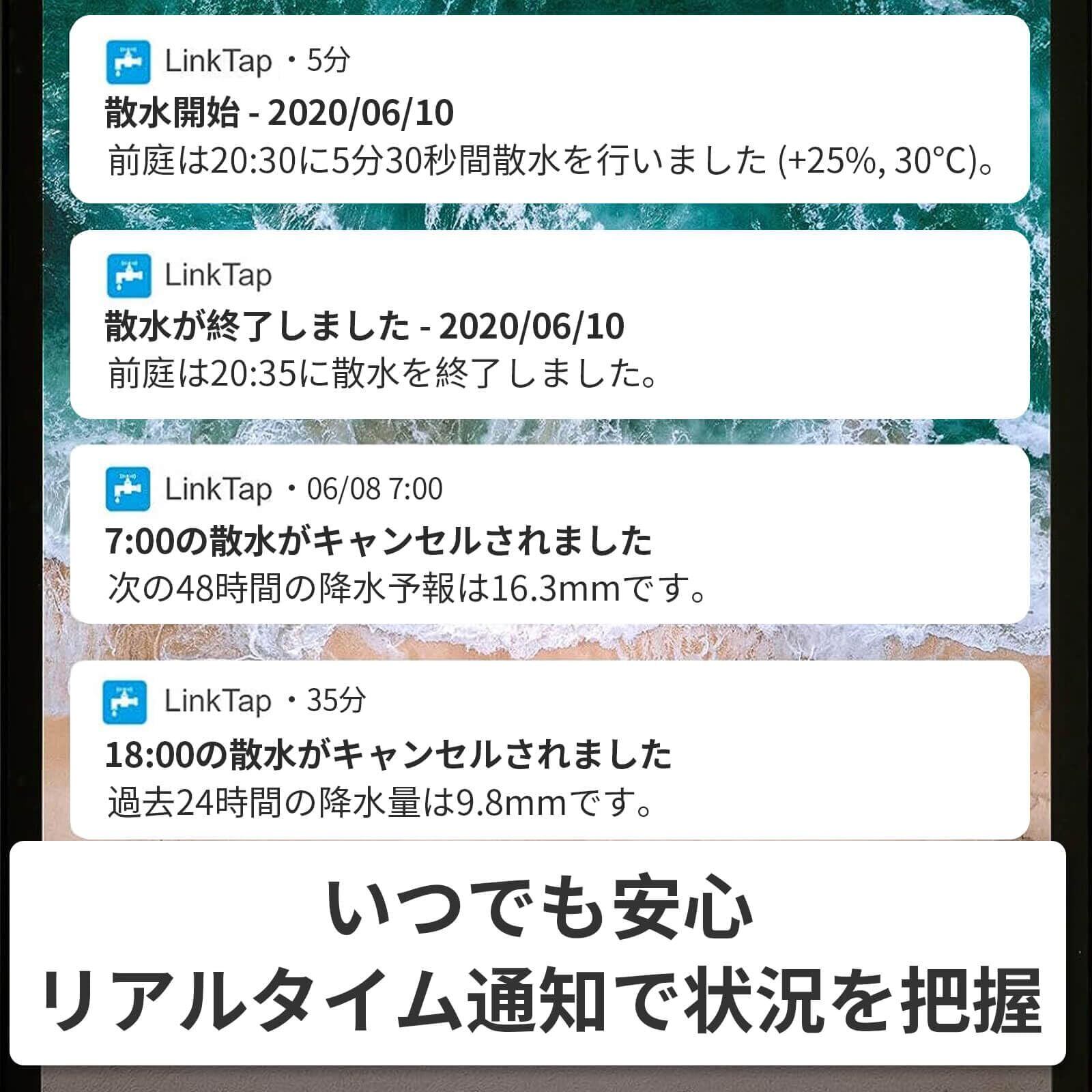 漏れ検出機能付き・リアルタイム通知機能 - 24時間体制で散水システムの漏れを監視し、問題が発生した際には即座にプッシュ通知でお知らせします。水漏れや詰まり、バルブの故障、デバイスの接続切れをリアルタイムで把握でき、安心してお使いいただけます。