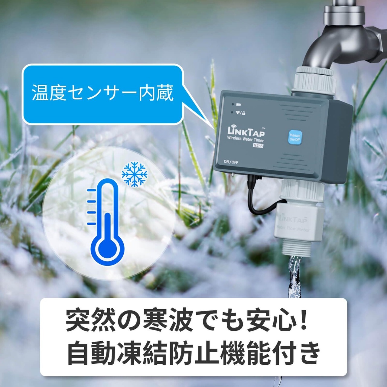 スマートな防寒機能 - 温度が設定したしきい値を下回ると、自動でバルブを開き、凍結防止を実現します。パイプの破損リスクを低減し、冬の寒冷地でも安心してご使用いただけます。