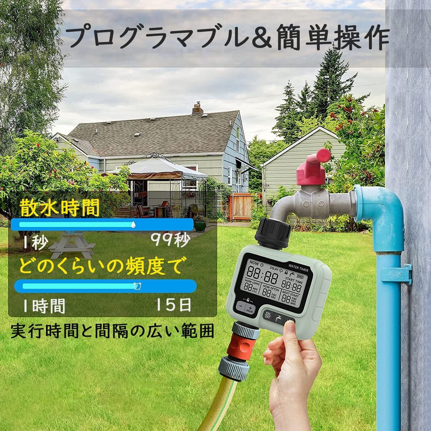 スマートレイン遅延モード 雨が降ったときに水ホースをオンとオフにする必要はもうありません。 ウォータータイマーには、非常に敏感な降雨センサーが装備されており、雨を検出して雨が止まると再び開くと、水バルブを自動的に閉じます。 大きなLCD画面。 このスプリンクラータイマーの巨大なLCDスクリーンディスプレイには、散水時間、散水頻度、バッテリーステータス、チャイルドロック、その他の関連情報が表示されます。 簡単なボタンで簡単にプログラムします。 ホース用のこのウォータータイマーは、簡単にプログラムできます。 季節と天気に基づいて、庭や芝生のために独自の散水プログラムを構築することができます。 散水期間を1〜99分、間隔を1時間から15日間設定できます。 手動散水モードが利用可能。 即時の水消費量のために、水タイマーの手動散水モードにより、事前にプログラムされた水散水スケジュールを妨げることなく、水ホースにアクセスできるようになり、水やりがよりシンプルで柔軟なプロセスになります。 柔軟性と広く使用されています。 この水ホースタイマーは、庭、芝生、花壇、農場、庭での使用に最適であり、毎日のスプリンクラータイマーの要件を満たしています。