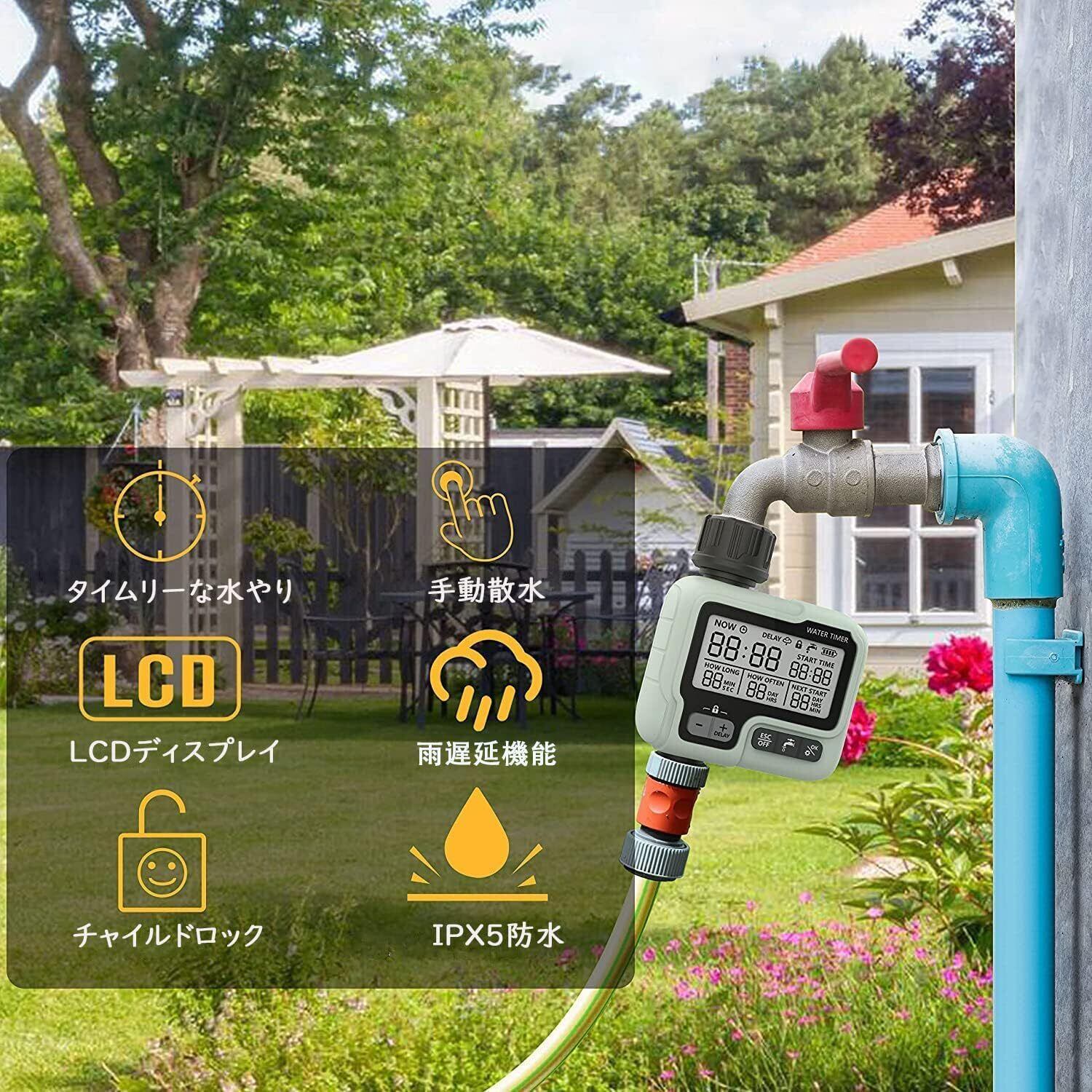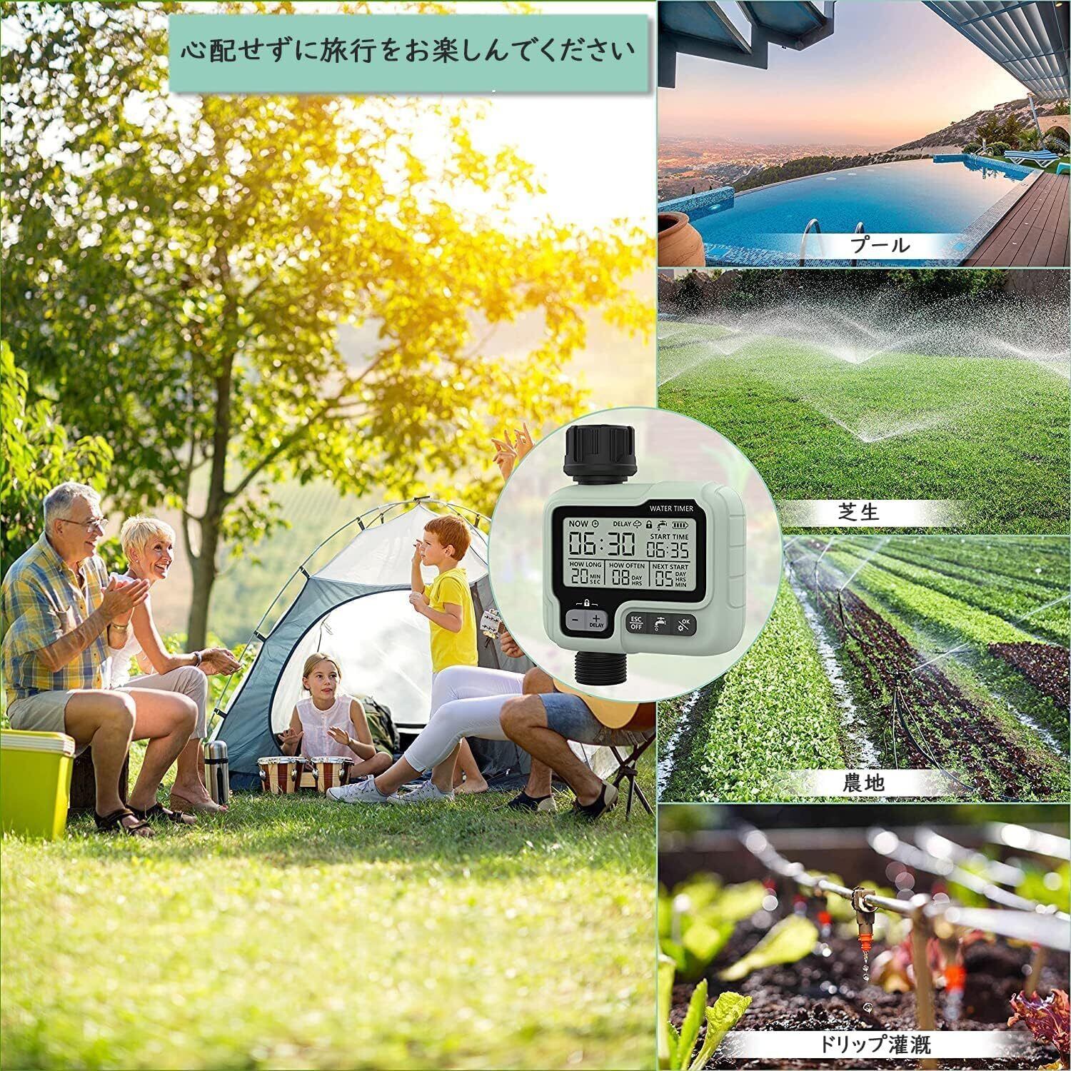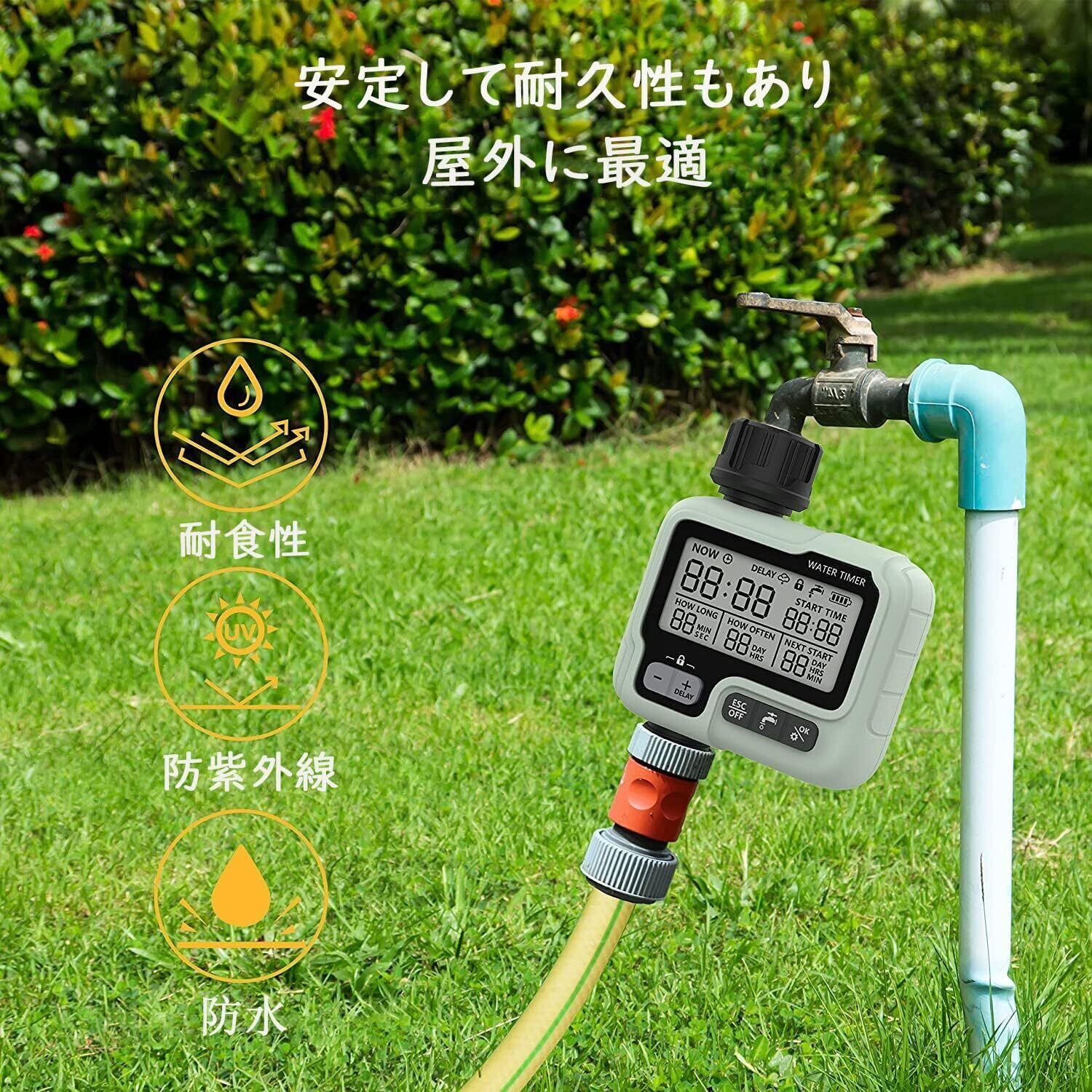 「スマート灌漑システム」:手動モードでは、予約された灌漑手順を中断することなく灌漑を即座に使用できます。雨遅延モードでの変化。これにより、灌漑プログラムを一定期間一時停止して、水を摂取しないようにし、不必要な廃棄物を避け、大量の水を節約できます。 雨の日に。 チャイルドロックモードは、スプリンクラータイマーが子供やペットの活動に誤って触れられないようにします。