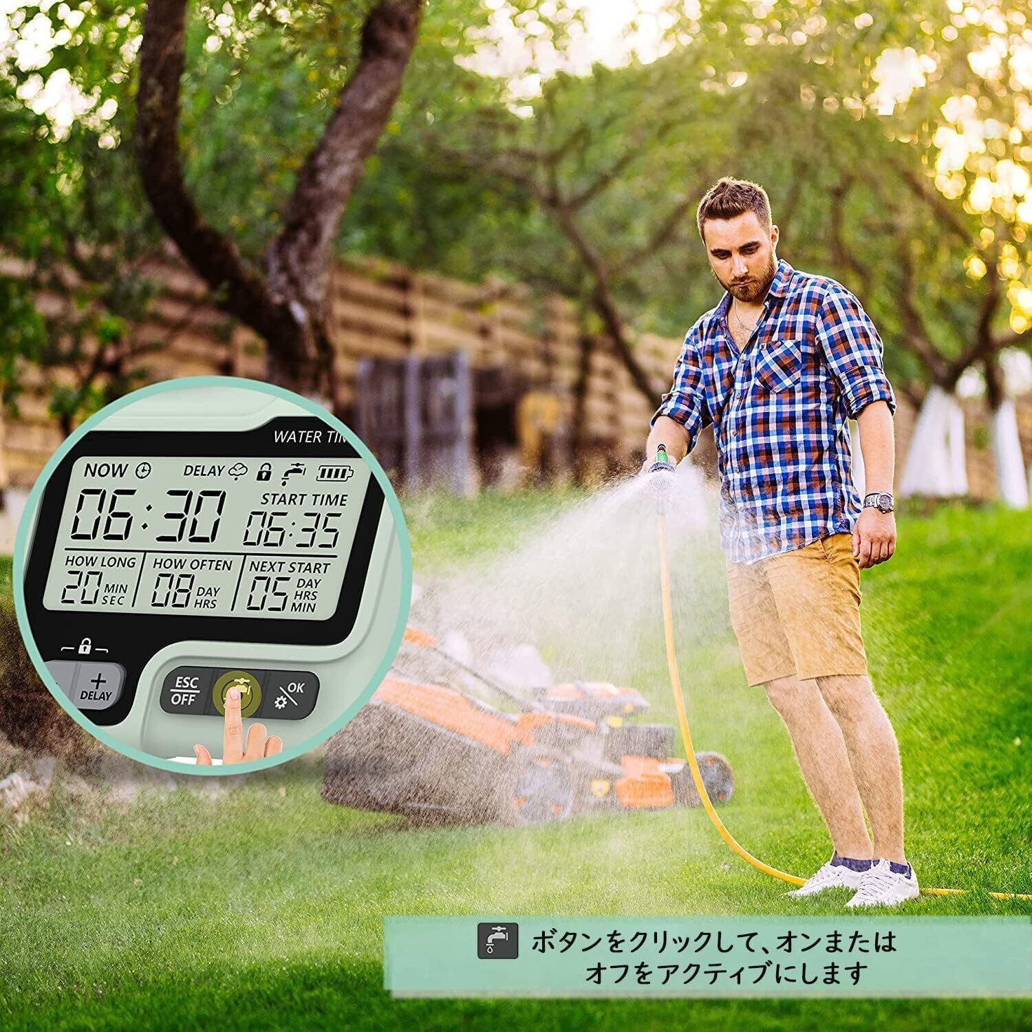 「手動雨遅延機能」:新しいアップグレードされたデジタルガーデンウォータータイマーは、手動の雨遅延機能を備えています。 雨季に柔軟に適用して、水を摂取するために水やりのスケジュールを遅らせ、芝生や植物を健康に保つために、時間と労力を手動で節約することで、手動で散水スケジュールを再スケジュールします