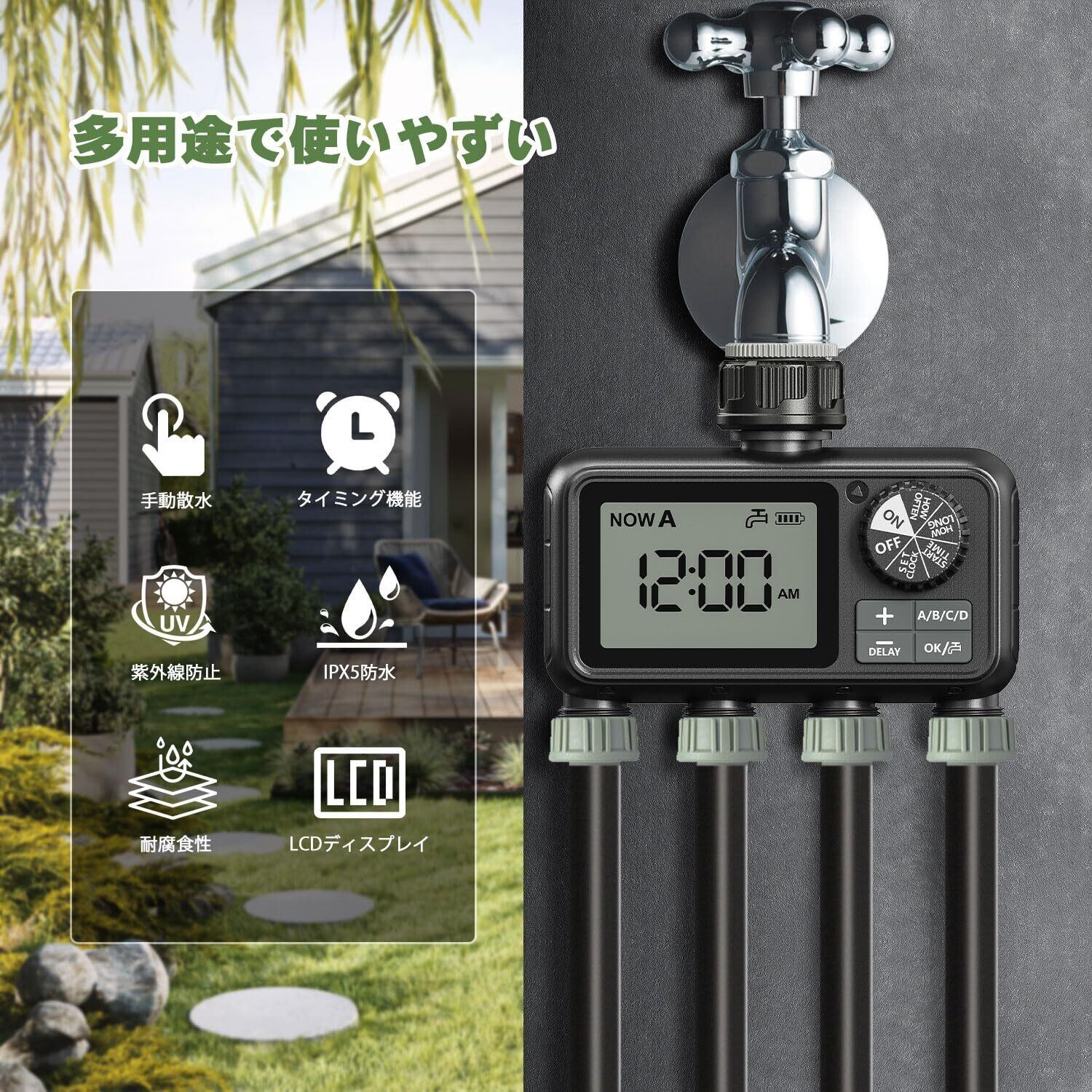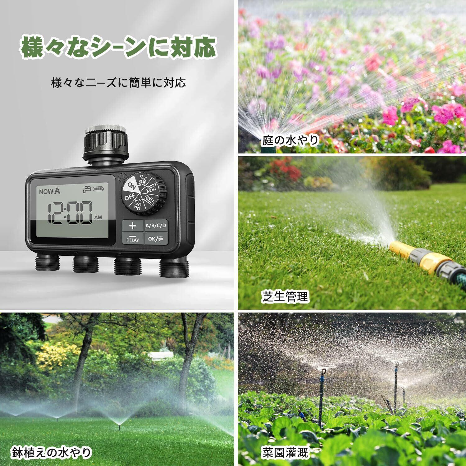 「4つの独立した散水エリア&真鍮材料インターフェイス」:この新しくアップグレードされた灌漑システムは、4つの独立したバルブが装備されている、あなたはより柔軟にあなたの散水計画を設定し、完全に1台のマシンのデュアル-目的機能を実現することができます。新しくアップグレードされた黄色い銅の材料インタフェース、より強い、より強い耐腐食性。