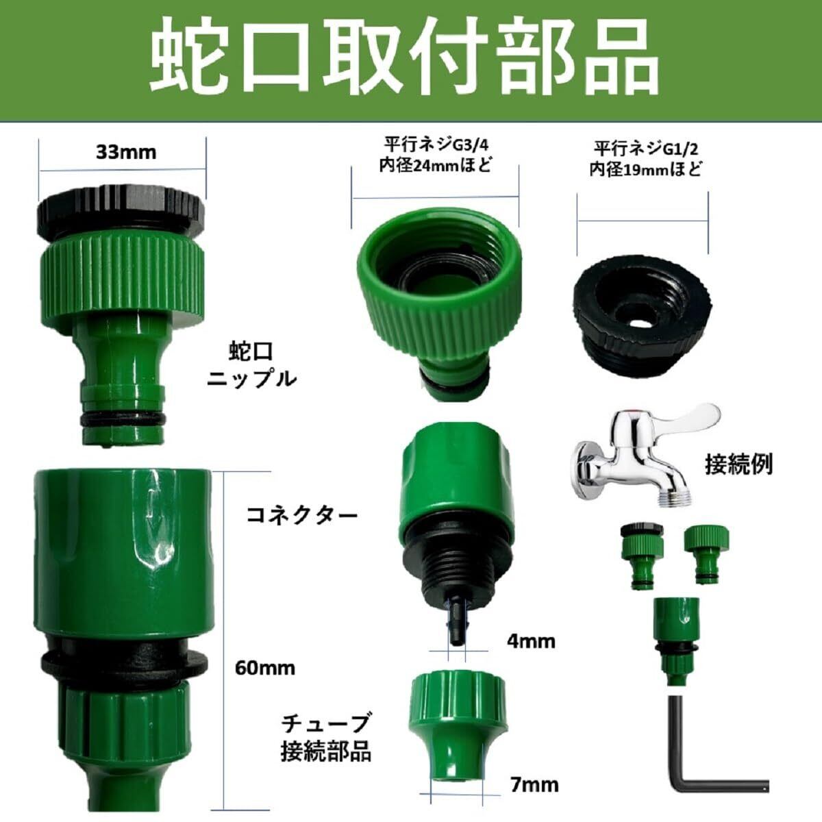 5 長さは3種類 【ミストノズル】 5m:10個(うち1個は先端用)、10m:20個(うち1個は先端用)、15m:25個(うち1個は先端用)、水道蛇口のアダプター1個(ロットによりオレンジ色とグリーン色がございます)、管:内径4mm、外径7mm_ _