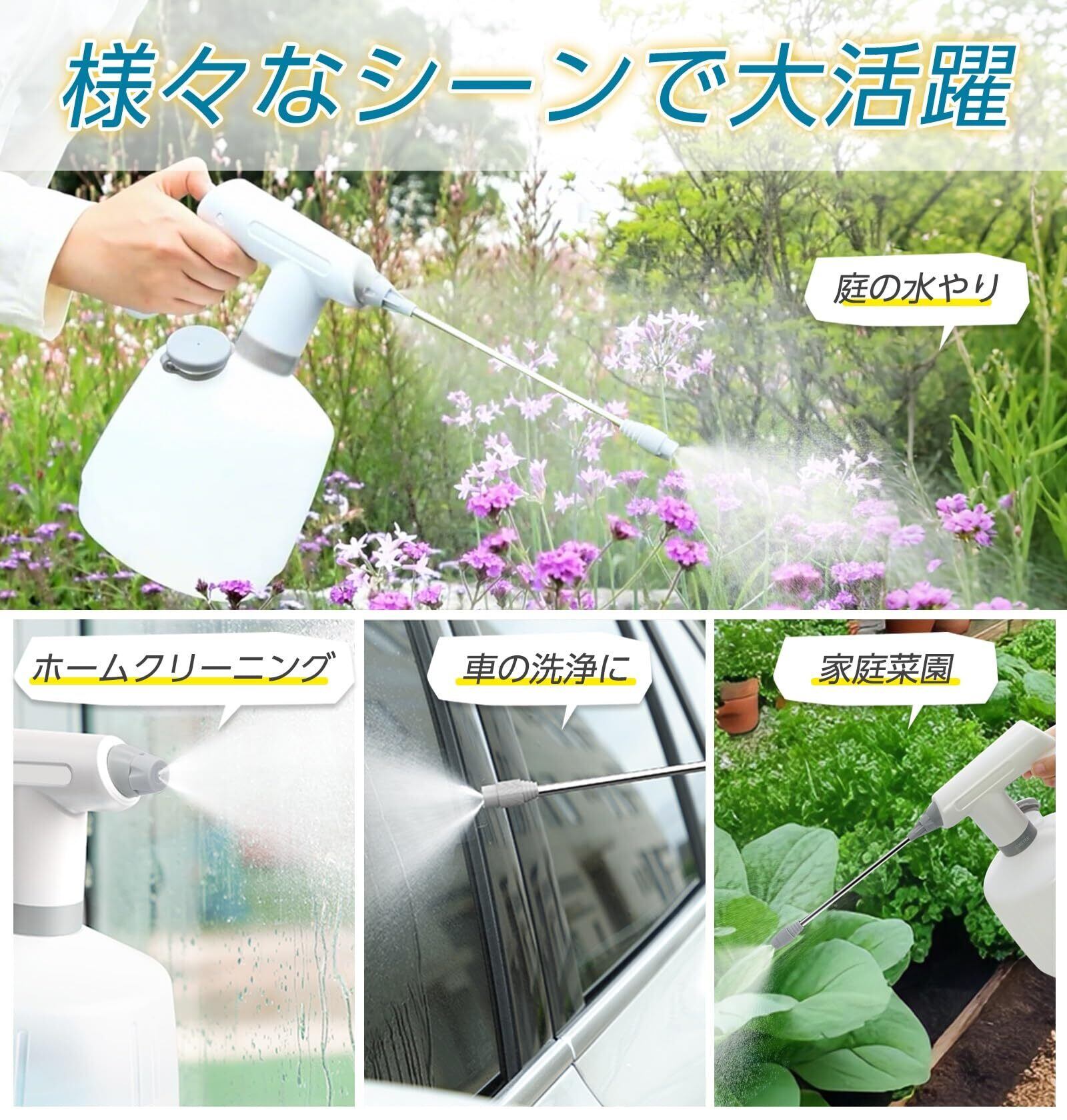 【マルチシーン対応】室内の観葉植物のお手入れから、庭木への農薬散布、車両洗浄、床清掃まで、家庭用から農業用まで幅広く活躍する実用的な電動スプレーです。