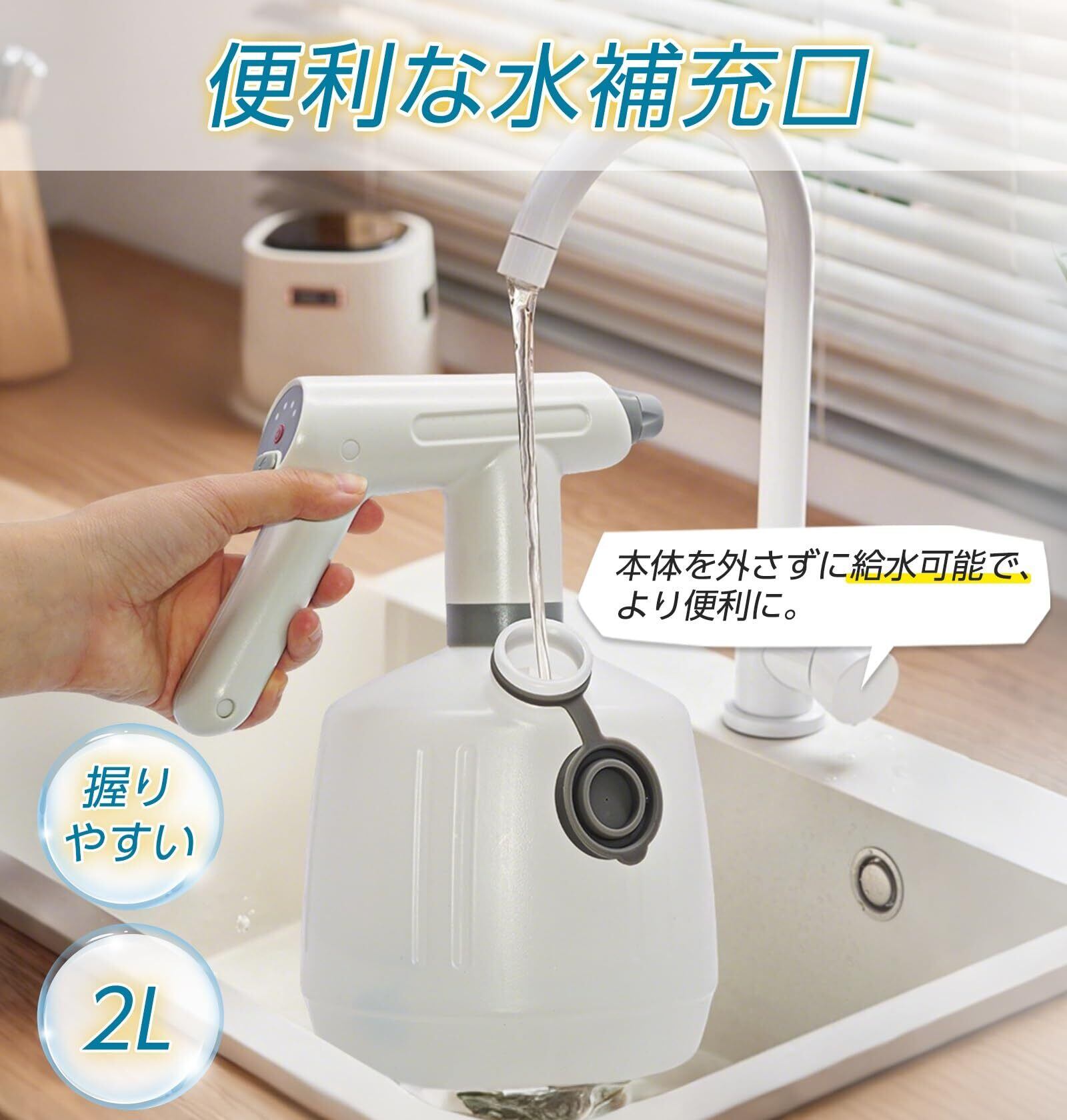 【電動スプレー&側面給水口】電動じょうろはワンタッチ操作で簡単ON/OFF!手動で加圧する必要がなく、ボタンひとつで連続噴霧可能。指や手首の負担を大幅軽減します。さらに側面給水口を採用しているので、面倒な本体分解は不要!タンク横の専用注ぎ口から直接水を補充でき、2Lの大容量タンクで日常使いに最適です。