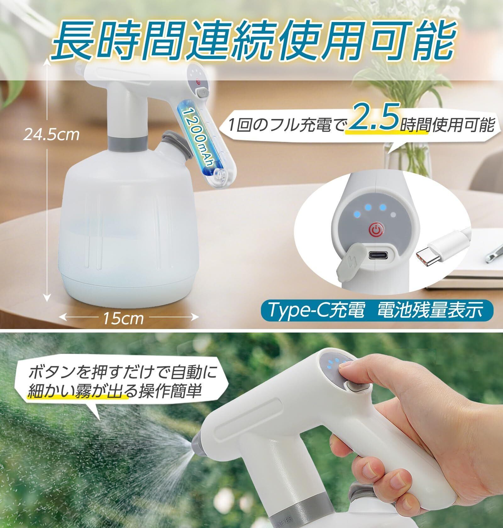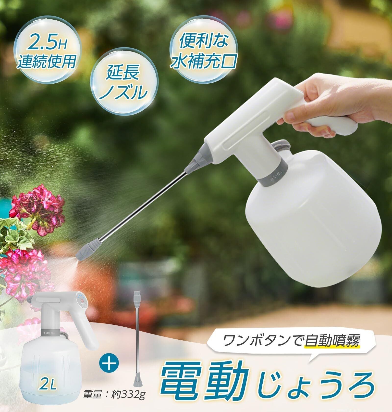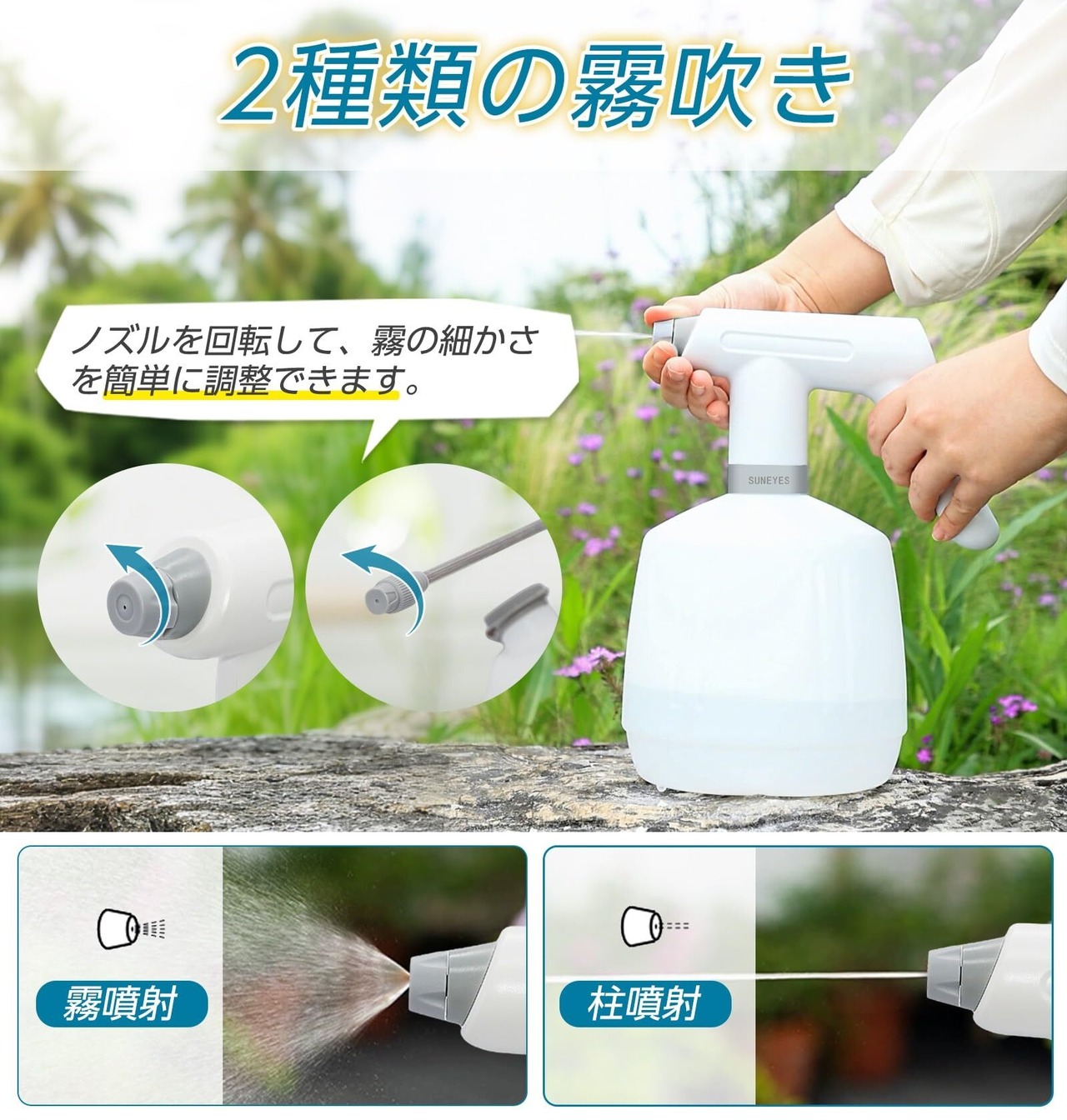 【特別価格】SUNEYES 電動じょうろ 噴霧器 電動スプレー 電動霧吹き 2L 大容量 側面給水口 自動 Type-C充電式 電動ウォータースプレー じょうろ 霧吹きスプレー 掃除 園芸 水やり 霧状 日本語取扱説明書付き NS030