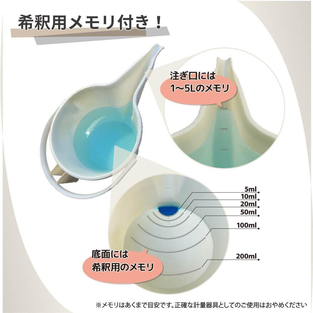 ・底面は希釈用メモリ付き!注ぎ口には1~5Lのメモリ付き!