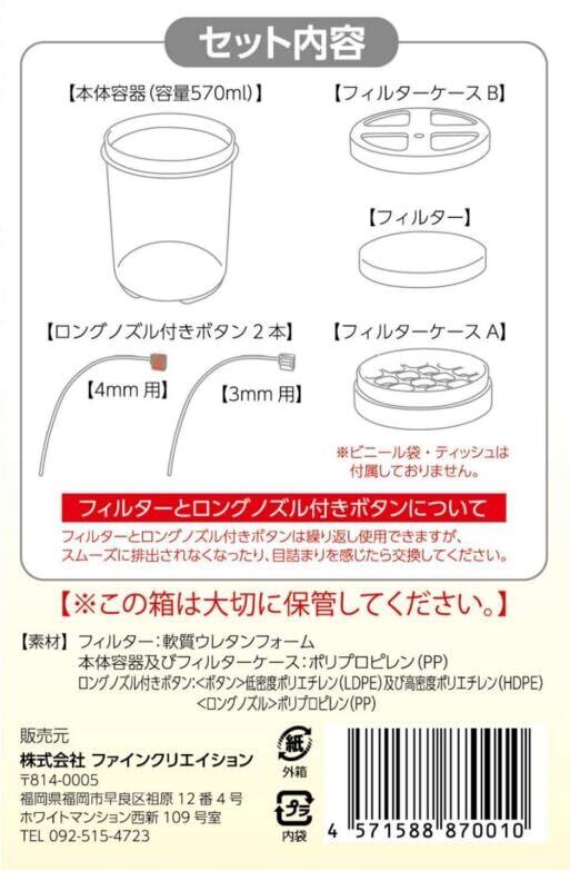 【セット内容】 本体容器(容量570㎖)・ フィルターケースA ・フィルターケースB・ フィルター ・ロングノズル付きボタン2種類