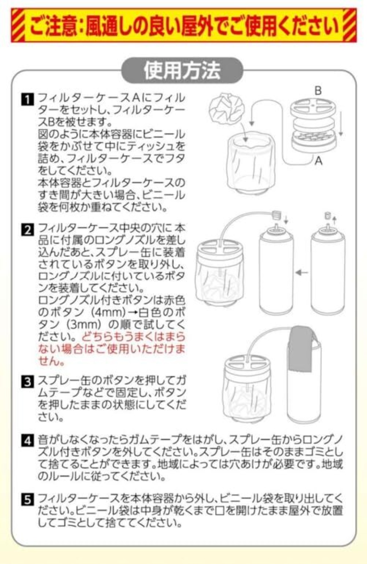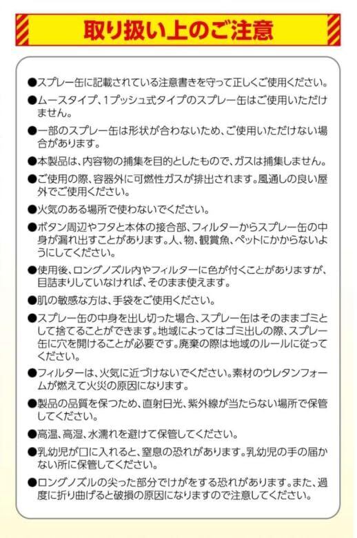 【ご注意】スプレー缶の中には、可燃性ガスが含まれています。ご使用の際は、風通しの良い屋外で、火気の無い場所で作業を行ってください。また、中身が残っている状態でスプレー缶に穴を開けると、中身が目や口に入ったり、吸い込んでしまったりと危険です。