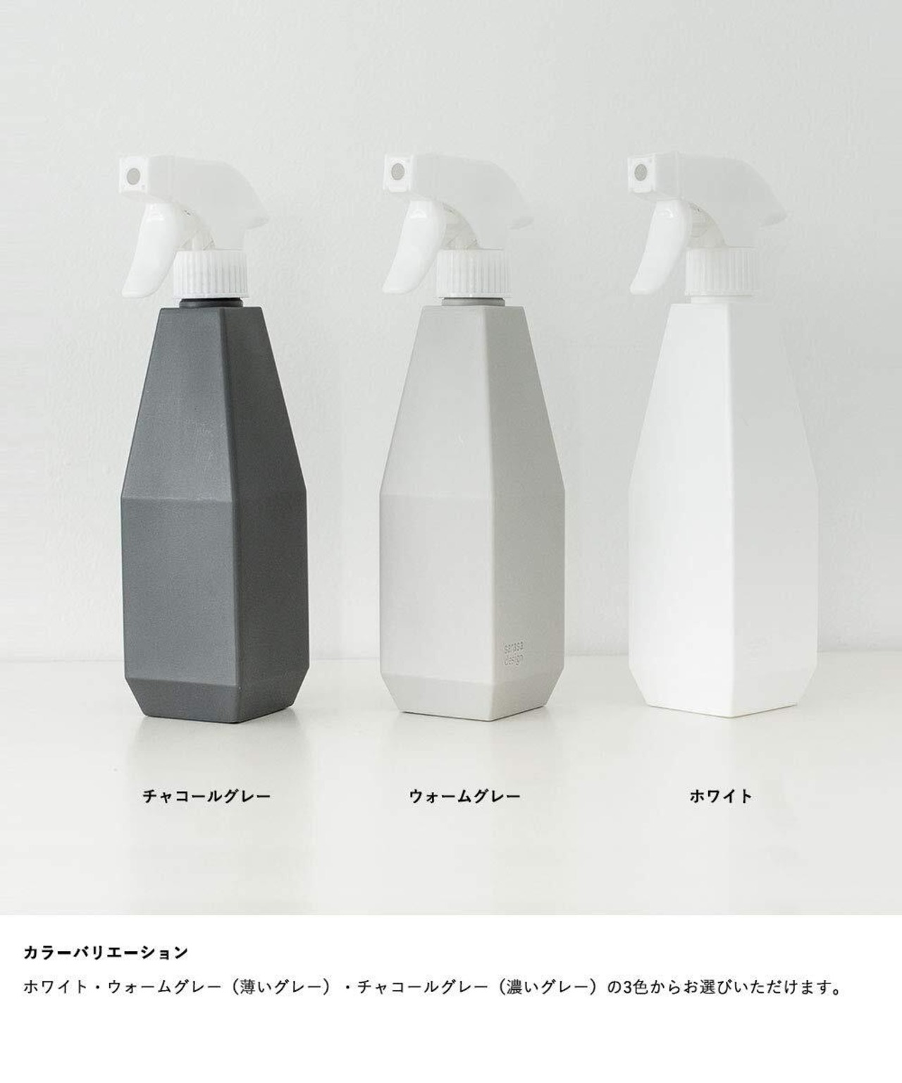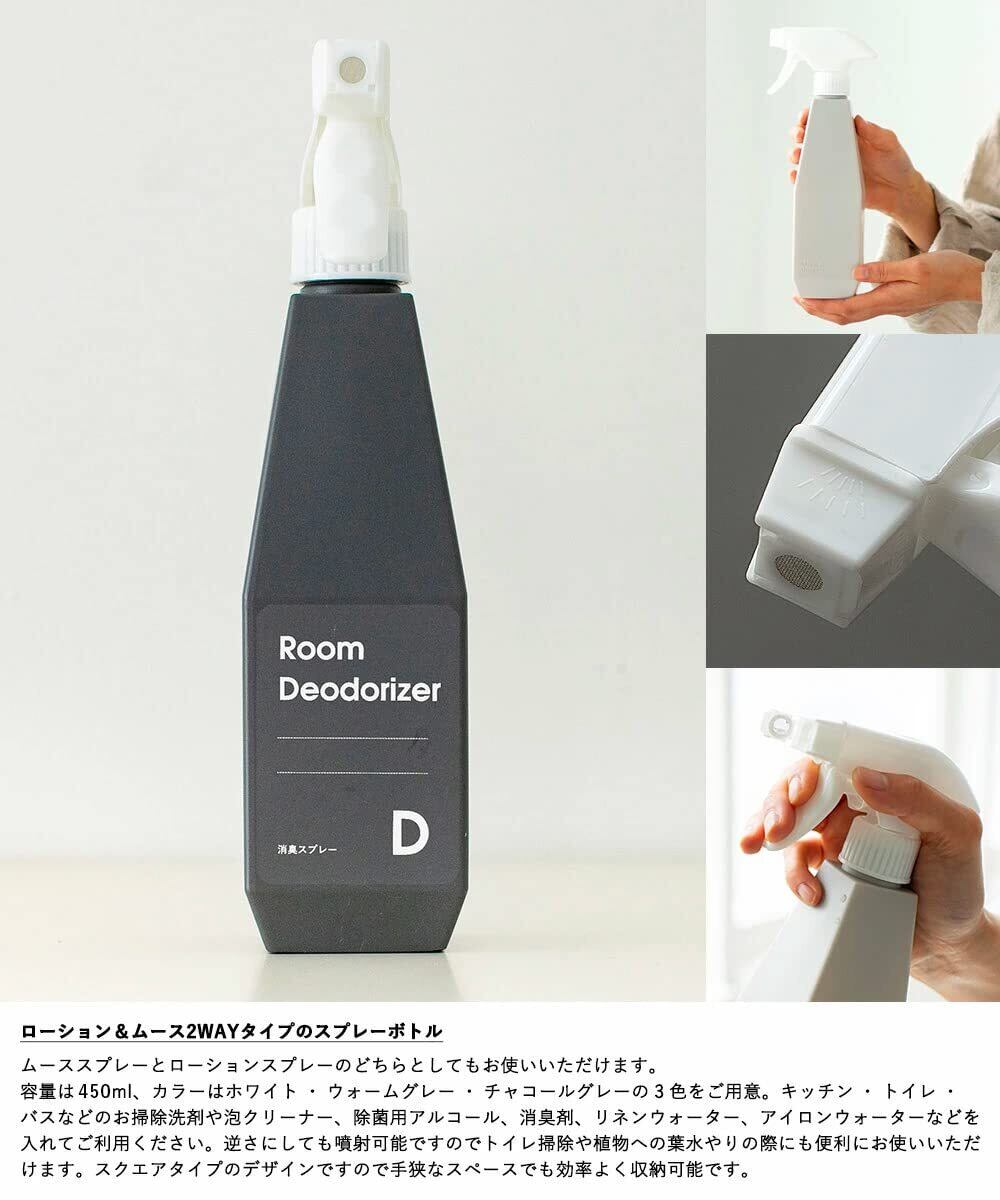 [商品仕様] 商品名:b2c 2wayスプレーボトル360° 2本入り サイズ:約W6×D6(ノズル含む)×H23.5cm、容量約450ml カラー:ホワイト、ウォームグレー、チャコールグレー 主な材質:スプレー:PP、本体:HDPE 原産国:中国 その他:一つのヘッドで通常の霧タイプ、ムースタイプを切り替えてご利用いただけます。逆さにしても噴霧可能です。