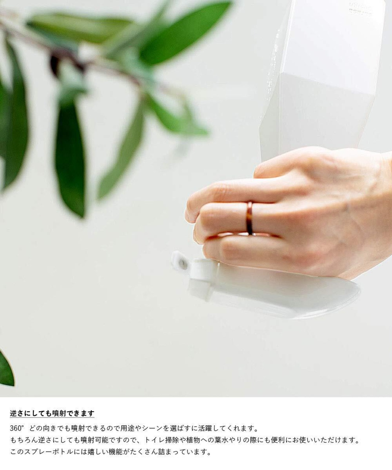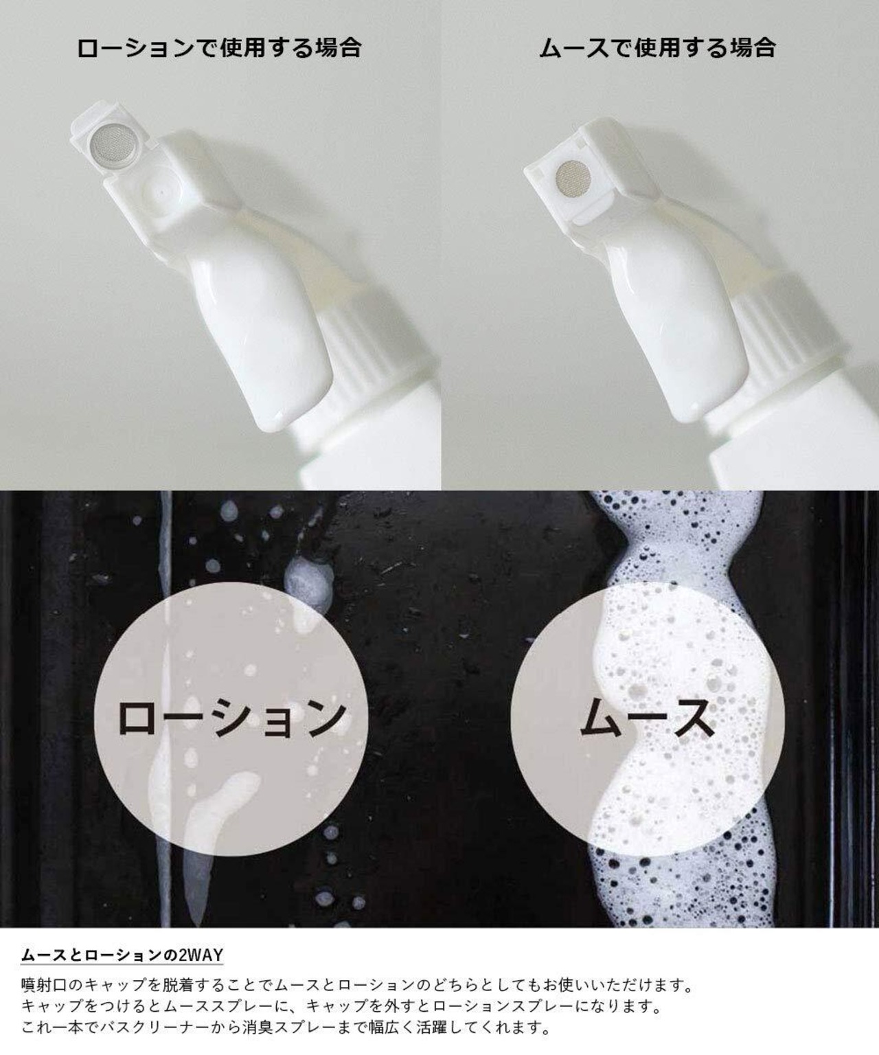 スプレーボトルスプレー1本でミスト&ムースの両方を切り替えてお使いいただけます。360°逆さにしても噴霧可能です。
