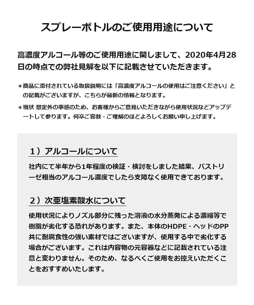 注意:「高濃度アルコール」や「次亜塩素酸水」のご使用に関しては最後の商品画像に記載がございます。本来の目的以外には使用しないで下さい。内容物は必ず内容物の注意書きに従ってお使いください。