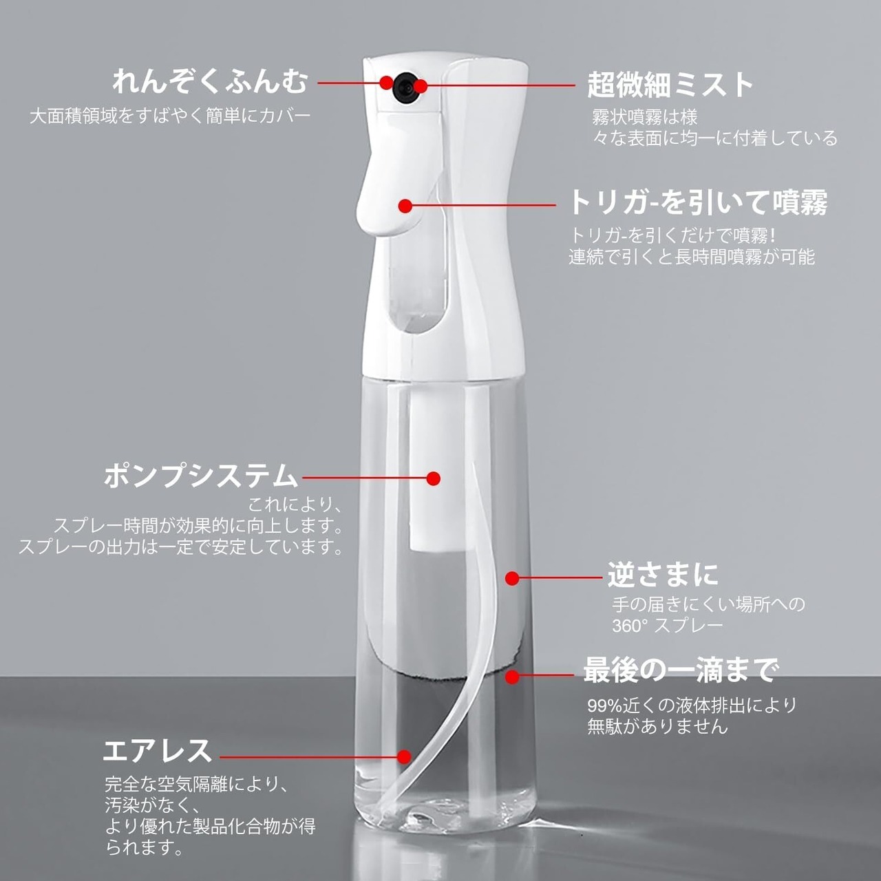 【連続超微細ミスト】ミストスプレーボトルを押すと、精密な高圧スプレーヘッド&0.3mmノズルで超細かいミストが均一に噴射できます。スプレーボタンは人間工学に基づいたボタンデザインで、広いハンドルデザインはスプレーの使い心地をより快適にし、手の疲れも軽減します。1回レバーを引くと高精細なミストを1~2秒連続噴射します。髪にスプレーすると、髪が濡れないことがされます。